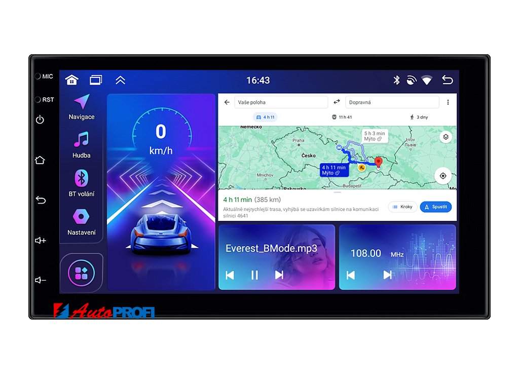 Svou oblíbenou písničku si v autě užijete s excelentní kvalitou zvuku. 2DIN autorádio Bmode PU01 na první pohled zaujme moderní technologií CarPlay a AndroidAuto, které se starají o bezproblémové zrcadlení a ovládání telefonu na displeji autorádia. Propracovaná 7palcová dotyková obrazovka zachycuje každý detail v HD rozlišení. Tím bezesporu zaujme spolujezdce při cestování. O vysoký výkon zařízení se stará čtyřjádrový procesor s podporou 4 GB / 6 GB RAM. Nepostradatelný zvukový zážitek je zaručen zvukovým ekvalizérem, který umožňuje upravovat reprodukci dle chuti. Funkce Bluetooth Vám umožní pohodlné a bezpečné Handsfree volání a vyřizování důležitých hovorů. Pokud si občas nevíte rady se správnou cestou, můžete využít zabudovaného GPS modulu, který Vás přivede na tu správnou cestu. Pomocí Google obchodu si můžete stáhnout svou oblíbenou GPS navigaci. Operační systém Android 15 se postará o ovládání nespočtů oblíbených aplikací. Pro bezpečné couvání můžete využít snadné propojení autorádia s parkovací kamerou. Autorádio nabízí možnost výběru z různých jazyků, které obsahují přeloženou základní část systému do českého jazyka.