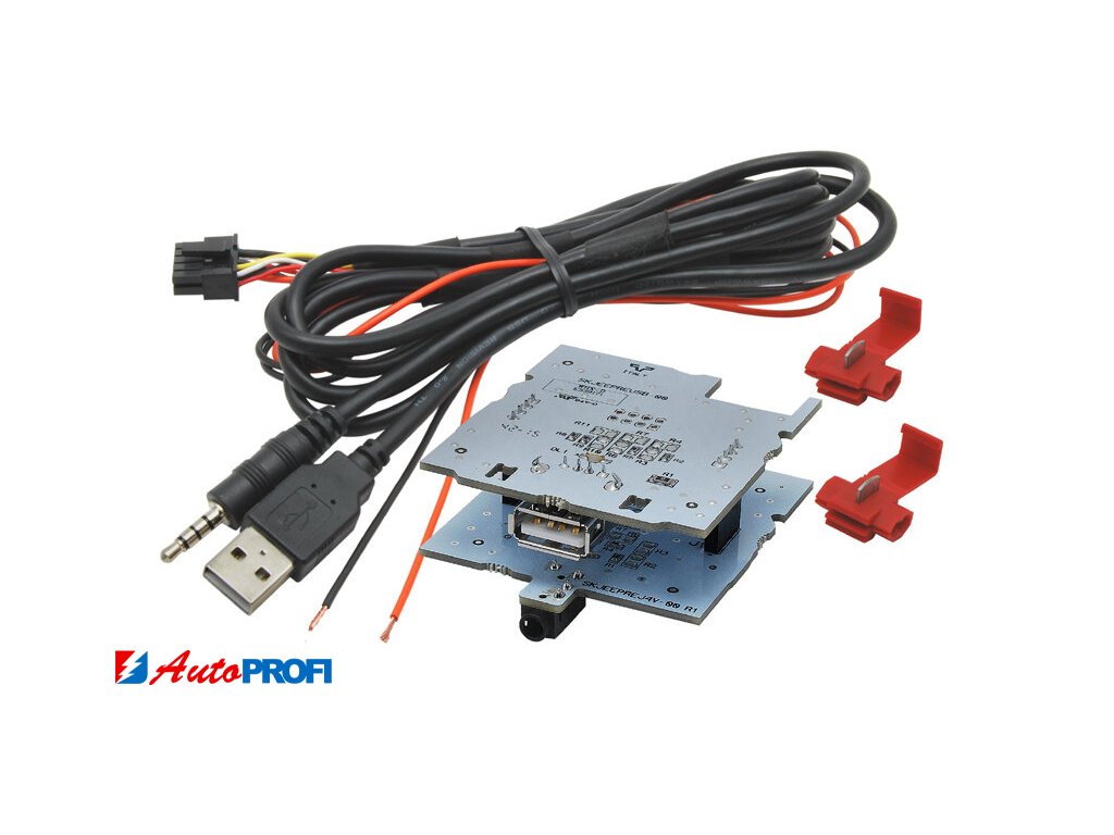 Adaptér pro připojení USB a AUX signálu, nahrazuje původní konektor v automobilu při použití aftermarket (dodatečně) instalovaného autorádia.