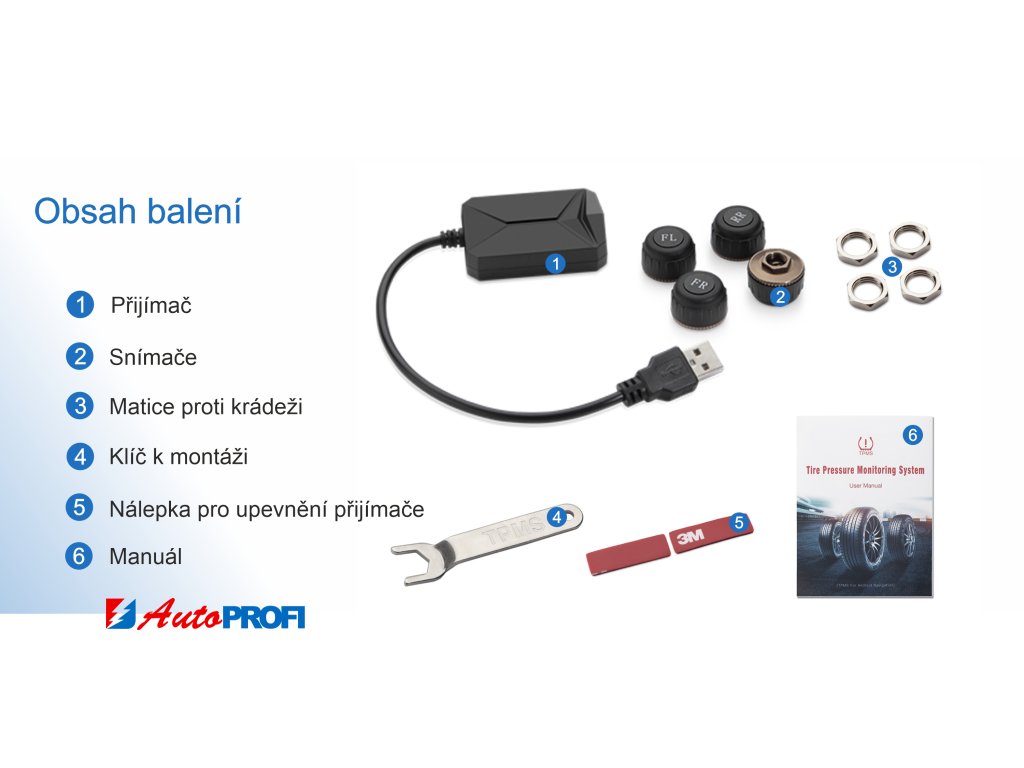 Díky snadné instalaci se k informacím o Vašich pneumatikách dostanete opravdu snadno. Stačí senzory TPMS spolu s maticemi našroubovat místo venkovního ventilku pneumatik. Poté připojíte přijímač pomocí USB k chytrému autorádiu se systémem Android 9 a vyšší a po stažení speciální aplikace už můžete sledovat momentální teplotu a tlak v pneumatikách.