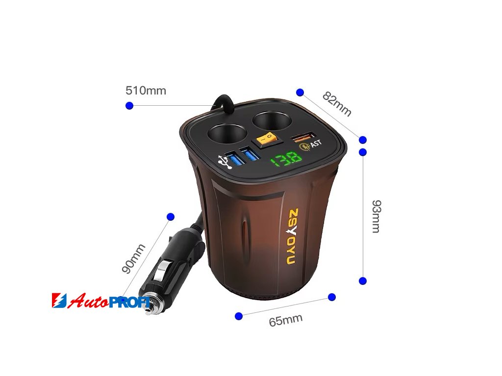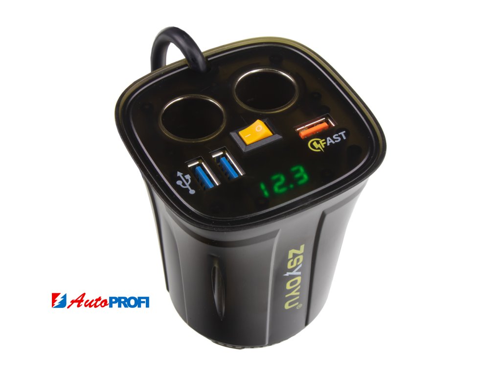 Dvojitá CL zásuvka s 3x USB do držáku nápojů s kabelem a CL zástrčkou a kontrolou stavu autobaterie pomocí LED voltmetru.