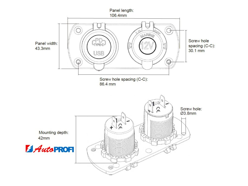 Dvojitá zásuvka do panelu 1x CL (max. 20 A) + 2x nabíječka USB voděodolná.