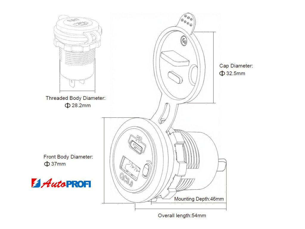 USB nabíječka do panelu, QC3.0 + USB-C, s krytkou proti prachu a vlhkosti.
