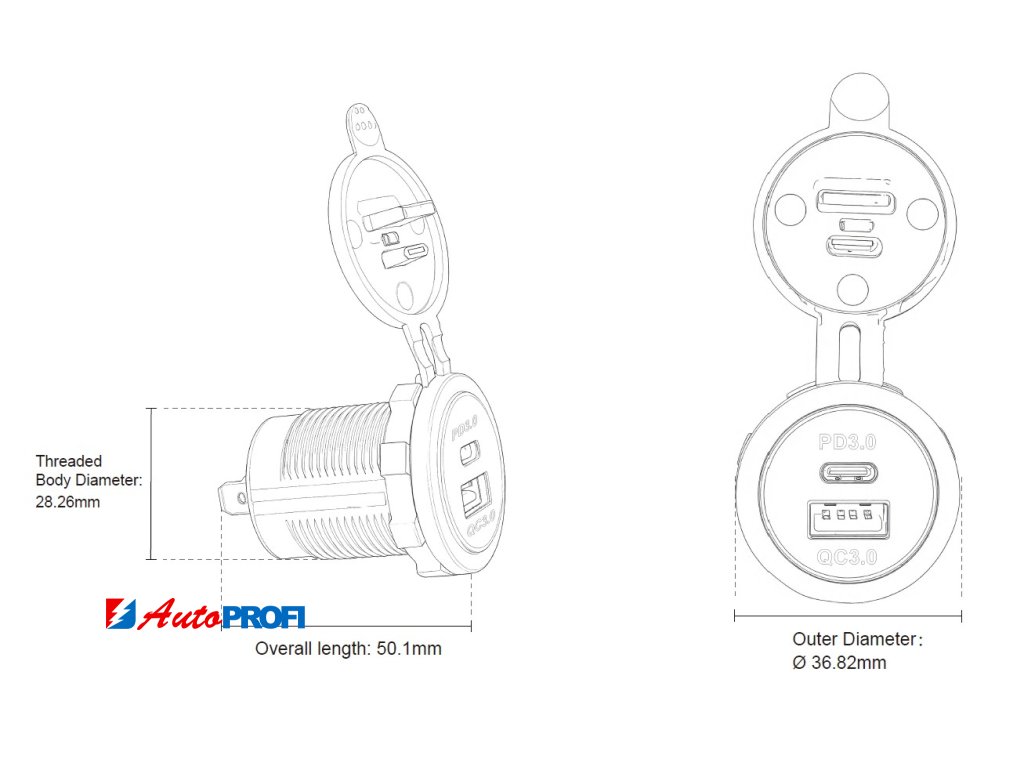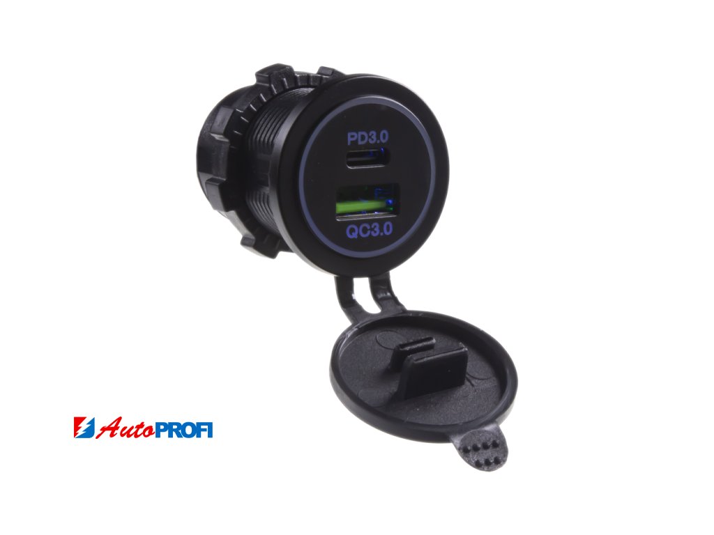 USB nabíječka do panelu, QC3.0 + USB-C, s krytkou proti prachu a vlhkosti.