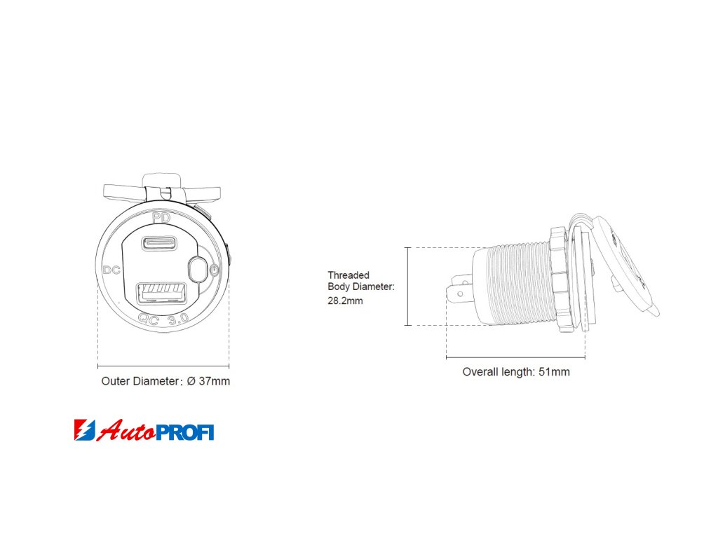 34725R USB nabíječka QC3.0 + USB-C, digitální voltmetr, hliníková do panelu, 12/24V