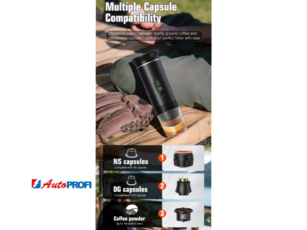 Milujete kvalitní kávu i mimo domov? Tento kompaktní a výkonný přenosný kávovar vám umožní vychutnat si plnohodnotné espresso na cestách, v kanceláři, při kempování i doma. Díky kompatibilitě s kapslemi Nespresso®, Dolce Gusto® i mletou kávou nabízí maximální flexibilitu a jednoduché použití.