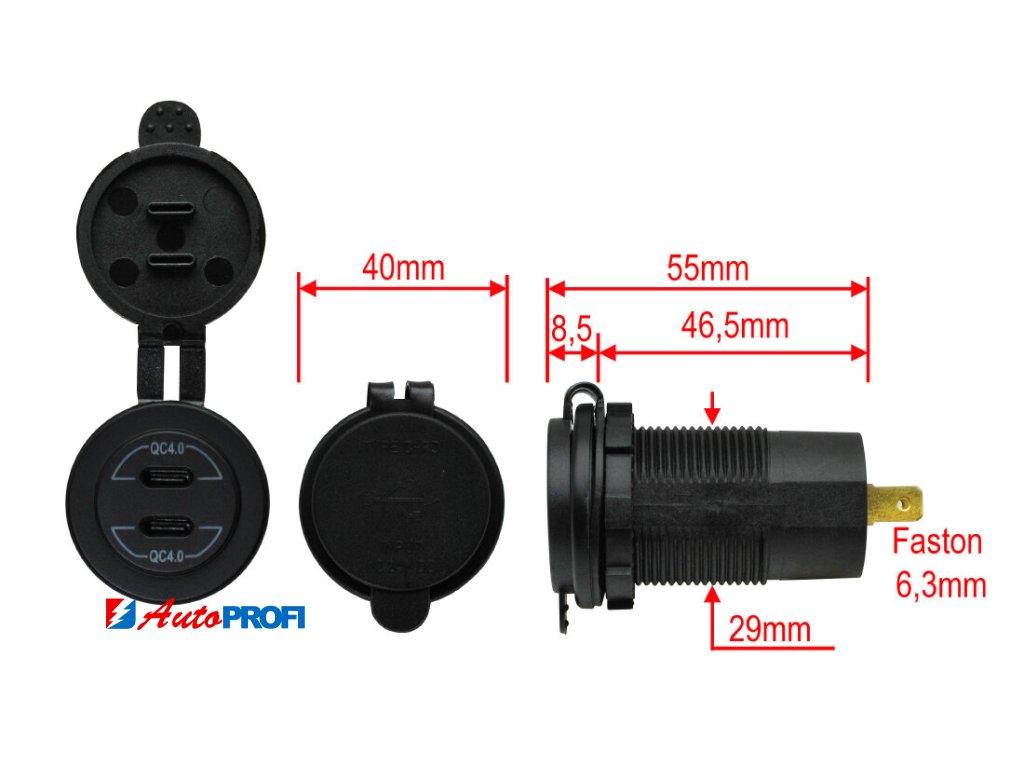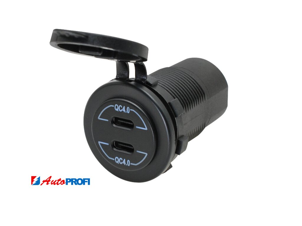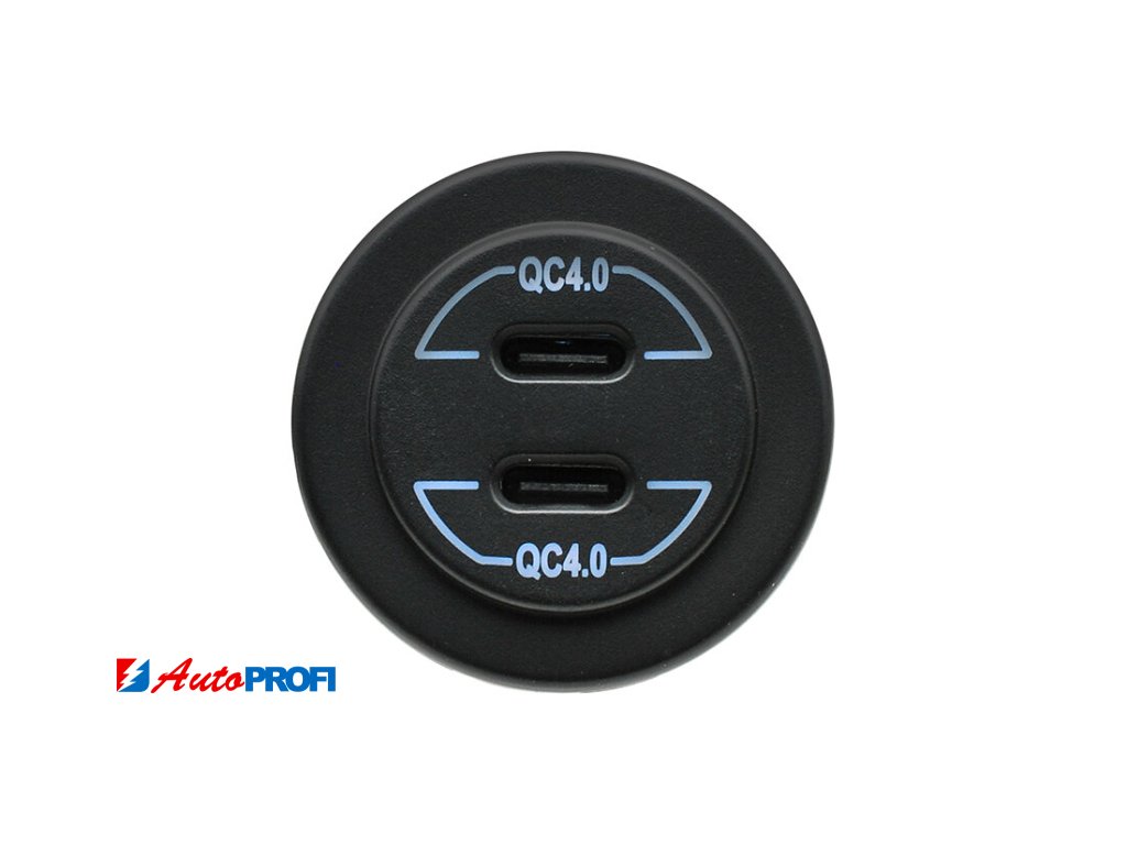 USB do auta se dvěma zásuvkami: QC4.0 PD Typ USB C 3.0A - určené pro rychlonabíjecí zařízení.