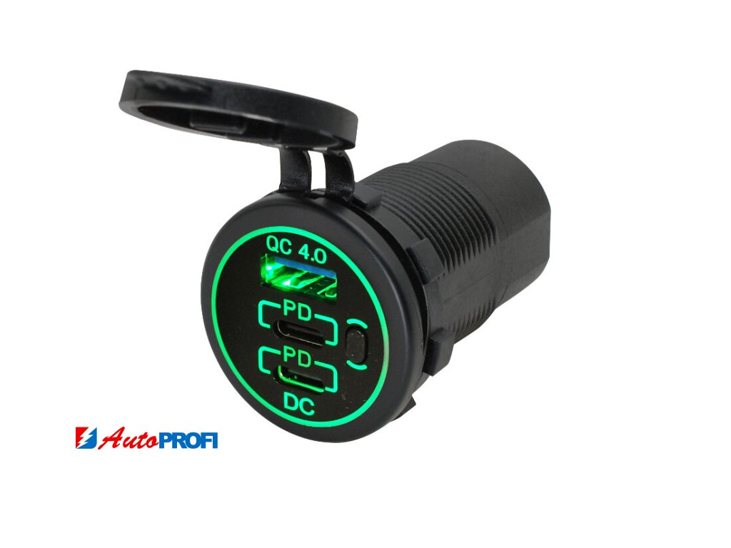 Měnič napětí 12/24V → USB-C QC4:PD + 1x USB-A- zelené podsvětlení