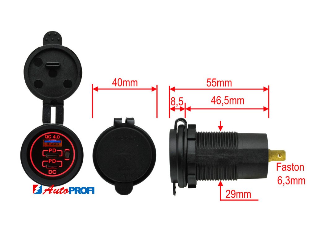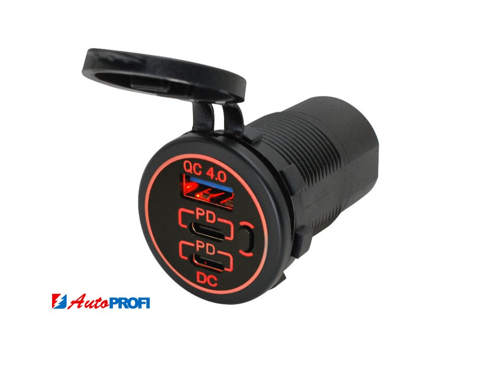 Měnič napětí 12/24V → USB-C QC4:PD + 1x USB-A- rudé podsvětlení