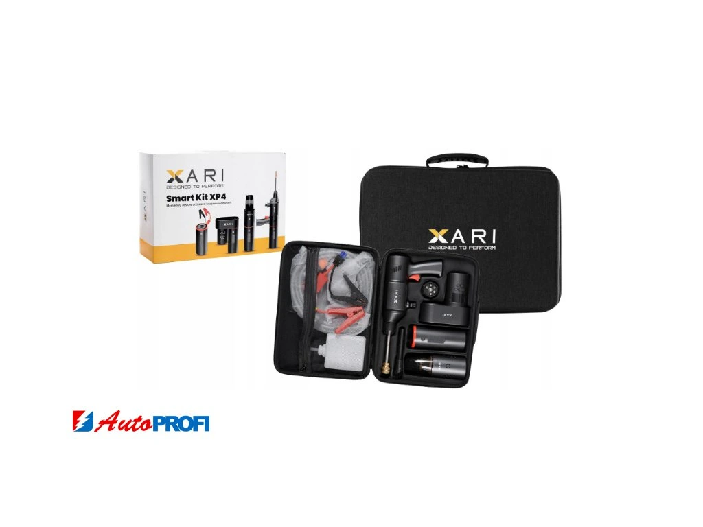 Powerbanka s kapacitou 15 000 mAh napájí všechna zařízení v sadě. Jednoduše sejměte ochranný kroužek z powerbanky a zařízení připojte. Tato kompaktní a přenosná sada je ideální na cesty. Veškeré příslušenství je zabalené v pevném pouzdře. Multifunkční sada Xari XP4 vám umožní umýt auto, vysát jeho interiér, dohustit pneumatiky a nastartovat auto v nouzi. Vysavač, tlakový čistič i kompresor lze navíc napájet také ze zásuvky zapalovače cigaret v autě (kabel se prodává samostatně).