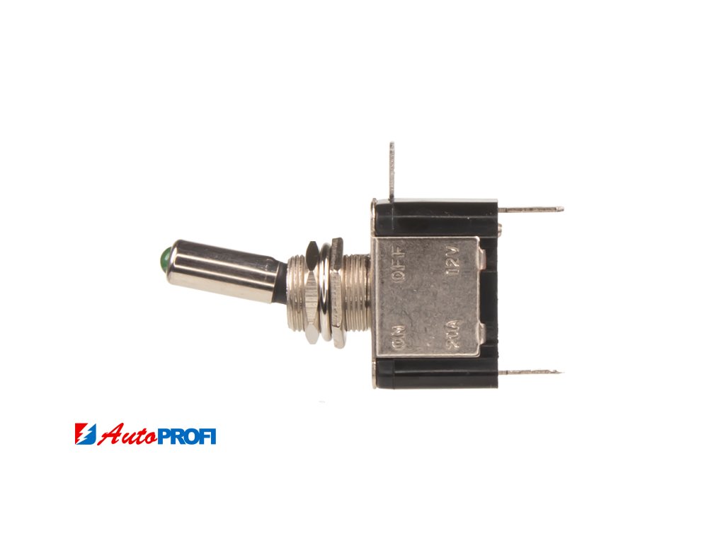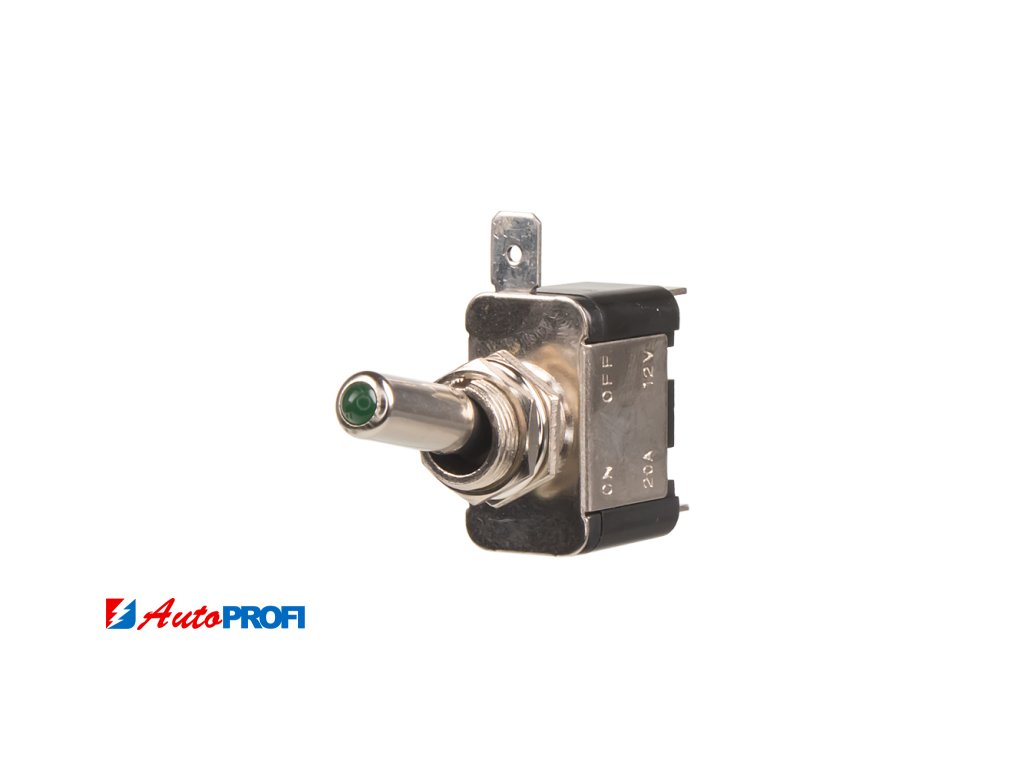 Elektrický spínač - páčkový 12 V - 20 A se zelenou LED. Letecký typ páčkového přepínače. Možno dokoupit plastovou krytku spínače samostatně.