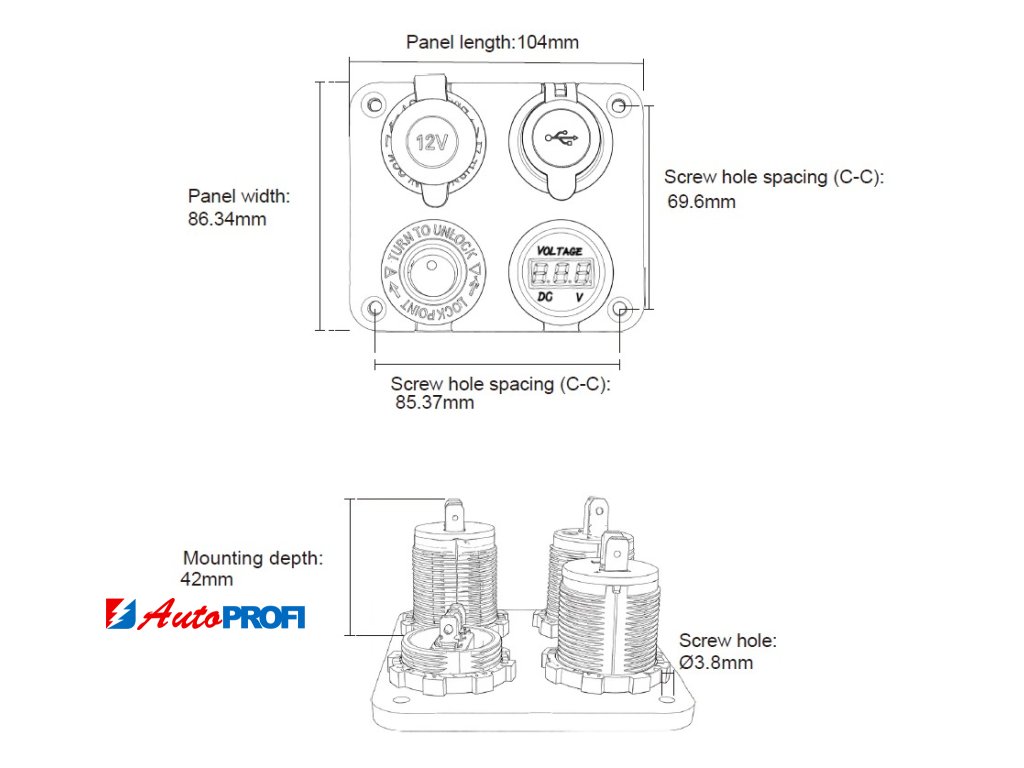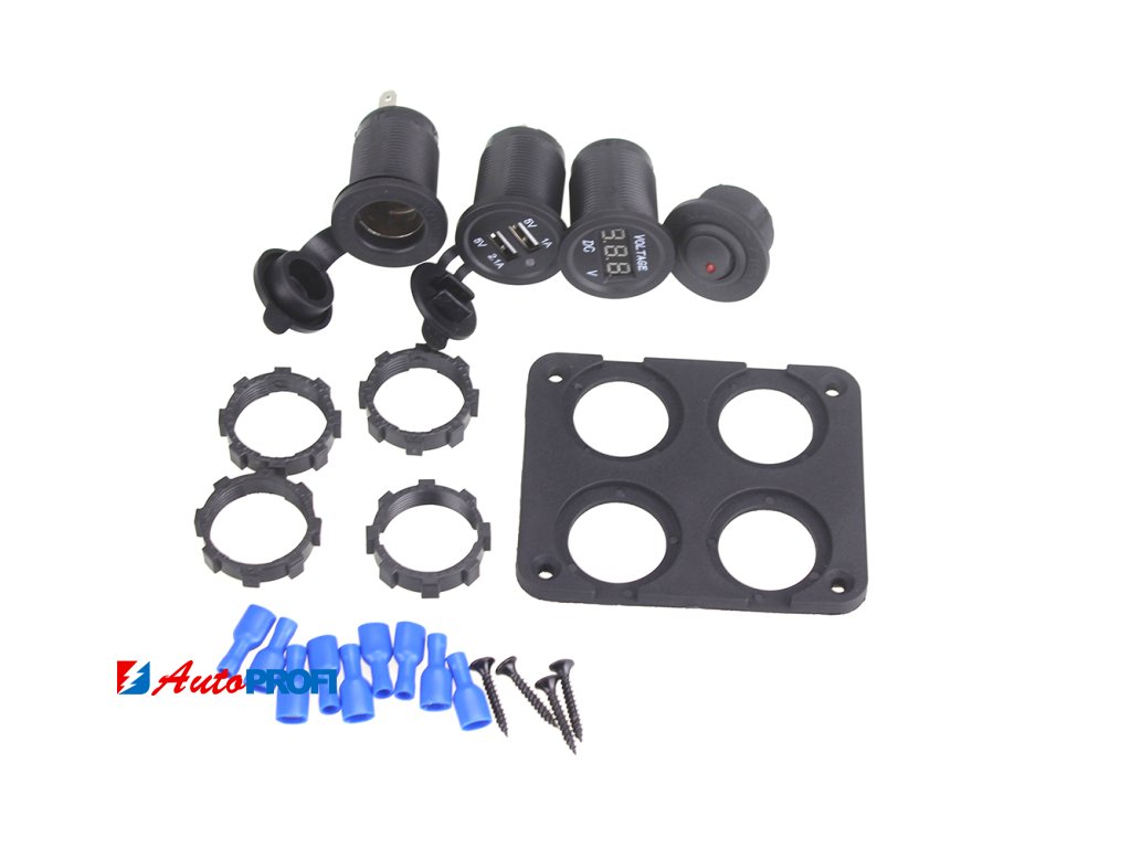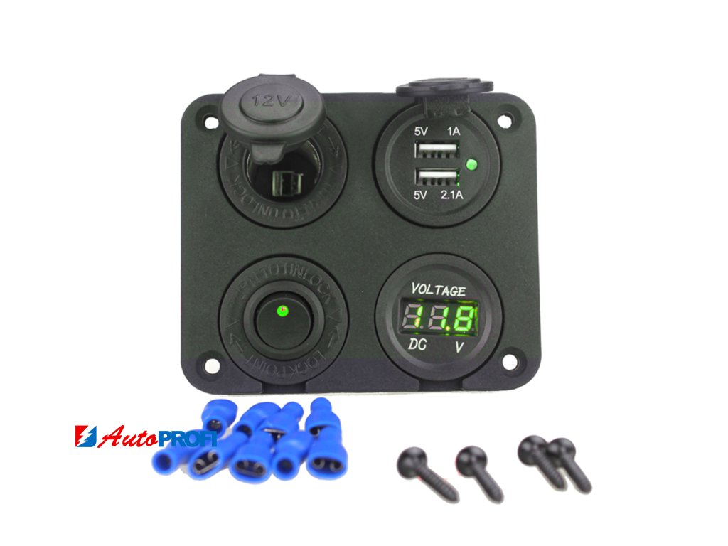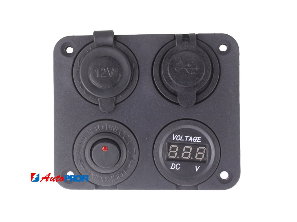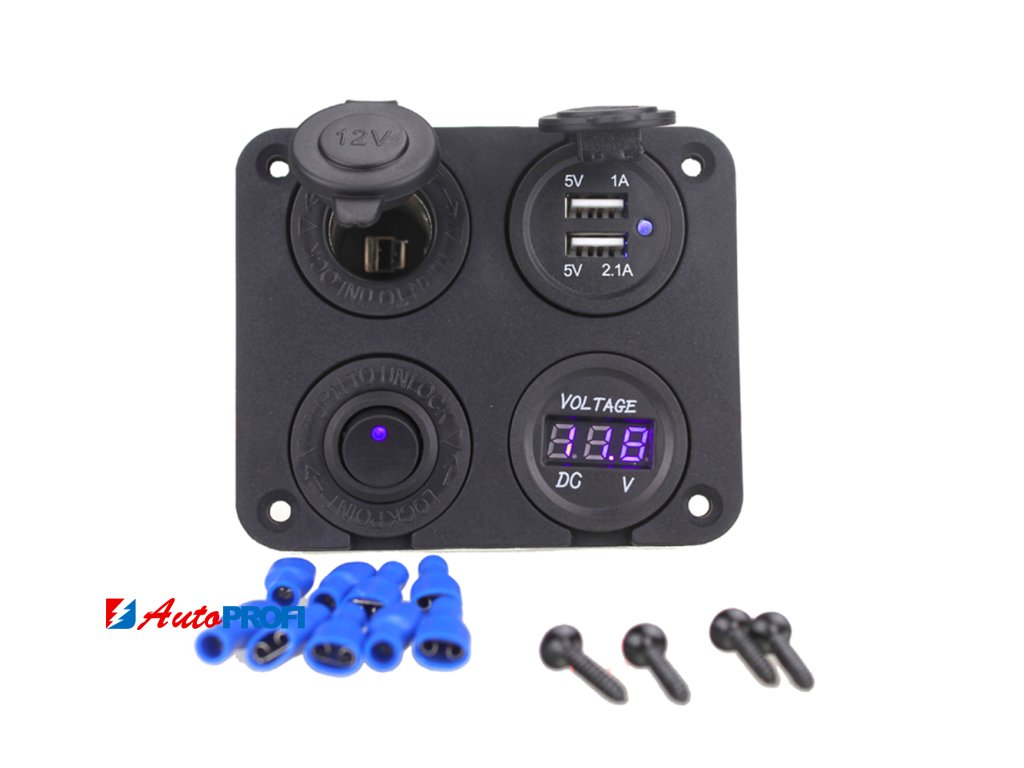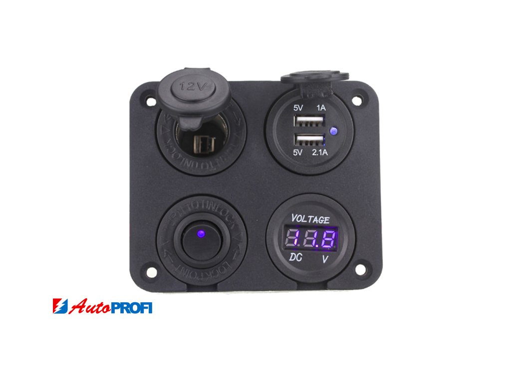 Panel s 1 spínačem, CL zásuvka, 2x USB zásuvka a samostatný voltmetr.