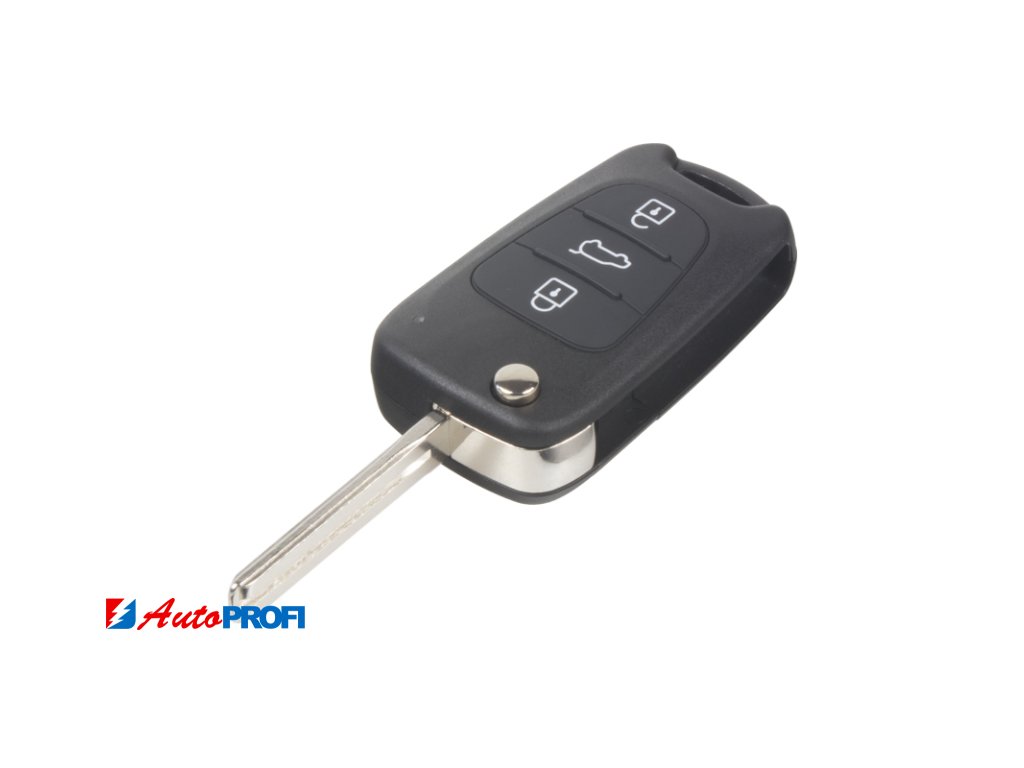 Náhradní obal vystřelovacího klíče pro vozy Hyundai, Kia s 3-tlačítkovým ovladačem (bez elektroniky a čipu imobilizéru). Do klíče je nutno vložit z původního klíče elektroniku dálkového ovládání a čip imobilizéru (transpondér), planžetu klíče je třeba nechat vyfrézovat podle tvaru originálního klíče.