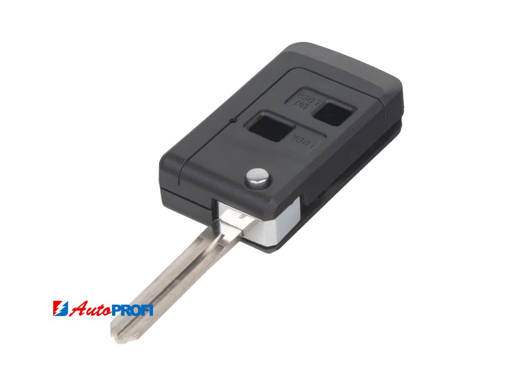 Náhradní obal vystřelovacího klíče pro vozy Toyota s 2-tlačítkovým nevystřelovacím klíčem (bez elektroniky a čipu imobilizéru). Slouží pro změnu ze staršího nevystřelovacího klíče na novější verzi s vystřelovacím klíčem. Do vystřelovacího klíče je nutno vložit z původního klíče elektroniku dálkového ovládání a čip imobilizéru (transpondér), planžetu klíče je třeba nechat vyfrézovat podle tvaru originálního klíče.