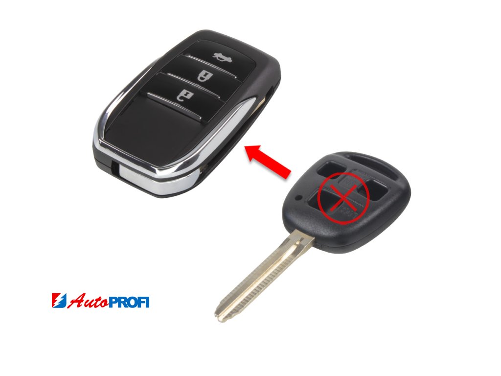 Náhradní obal vystřelovacího klíče pro vozy Toyota s 3-tlačítkovým nevystřelovacím klíčem (bez elektroniky a čipu imobilizéru). Slouží pro změnu ze staršího nevystřelovacího klíče na novější verzi s vystřelovacím klíčem.
