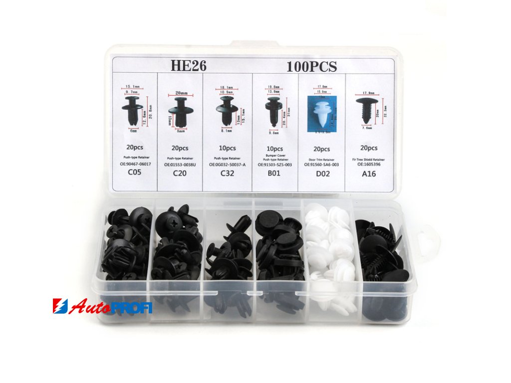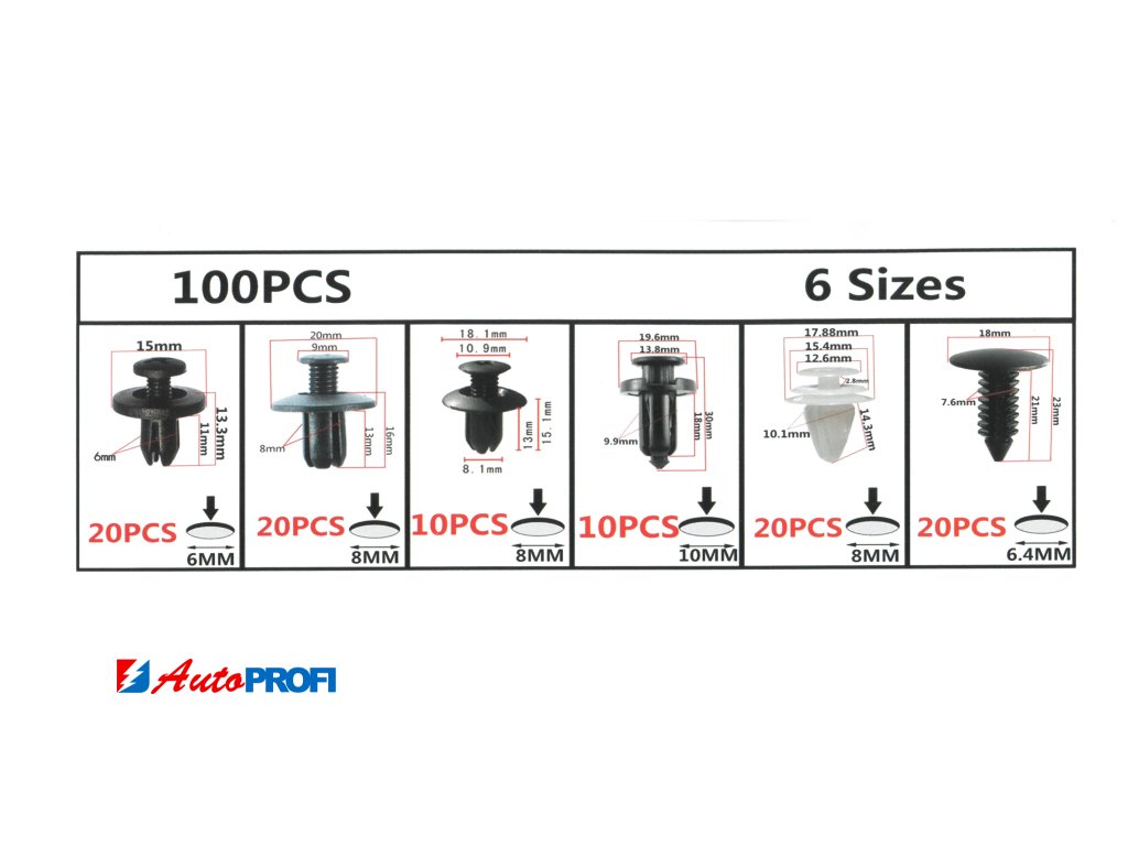 Sada obsahuje 6 druhů plastových příchytek ( celkem 100ks).