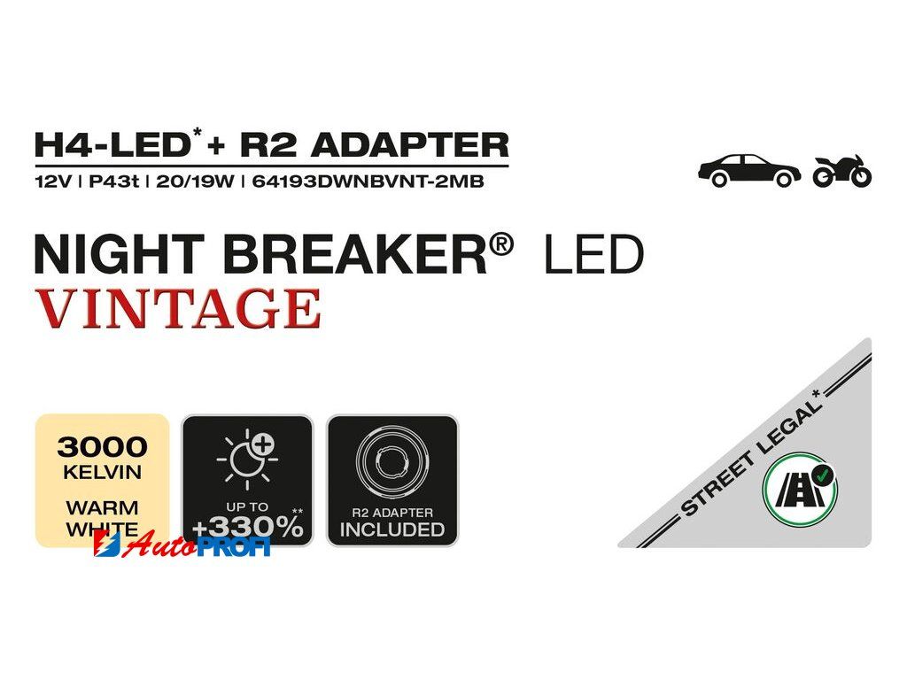 Vybavena dalším adaptérem R2 je LED žárovka NIGHT BREAKER LED VINTAGE H4 vhodná nejen pro náhradu H4 halogenové autožárovky, ale může být také instalována místo R2. Integrovaná technologie „Constant-Brightness“ zajišťuje konzistentní, spolehlivý výkon i při kolísajícím a nízkém napětí baterie – pro působivý výkon a stabilní jas a bezstarostný pocit při každé jízdě.