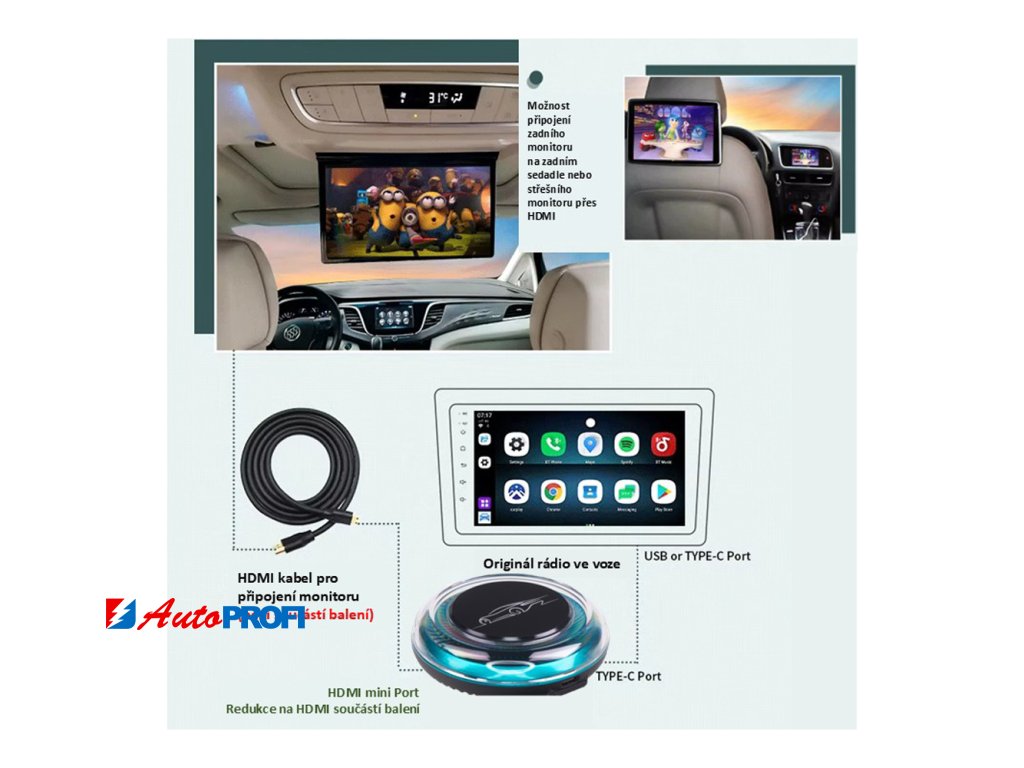 Připojte jej a promění OEM stereo vašeho auta na systém Android, vaše původní kabelové OEM CarPlay/Android Auto na bezdrátové a zároveň vytvoříte z rádia multimediální zařízení se systémem Android využitelné jako navigace přehrávač atd.