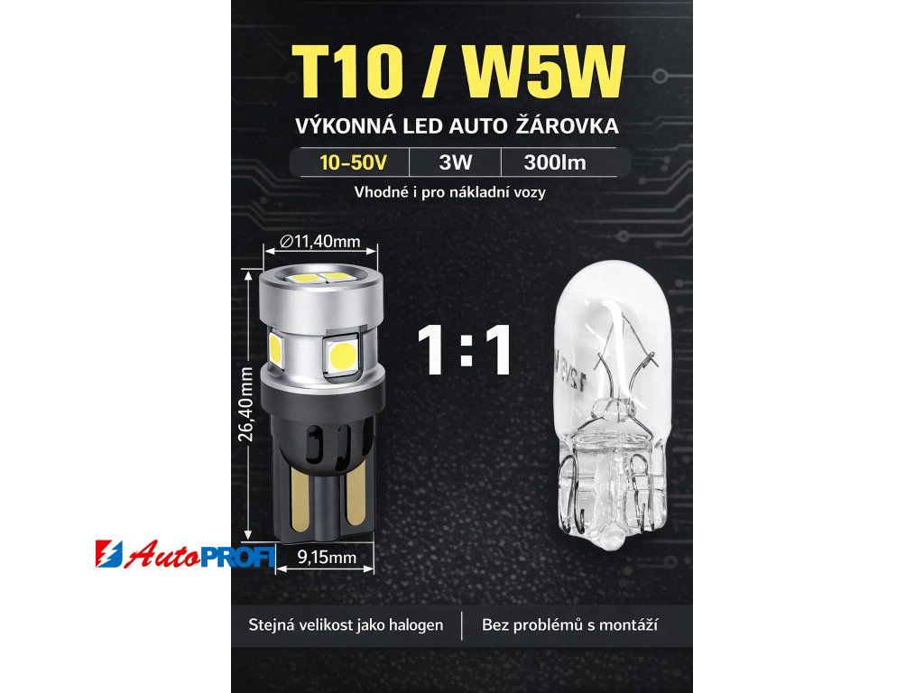 Výkonná LED žárovka T10 / W5W je navržena speciálně pro vozidla, kde dochází k větším výkyvům napětí – typicky nákladní vozy, užitková vozidla, pracovní stroje nebo elektrokola.
