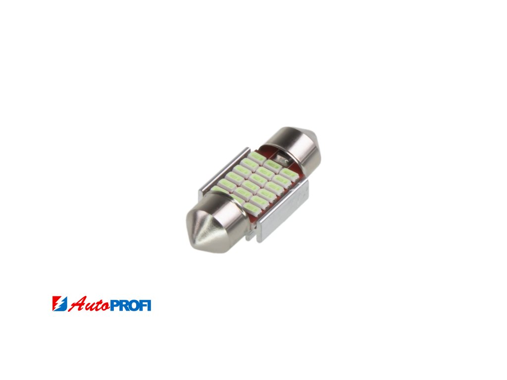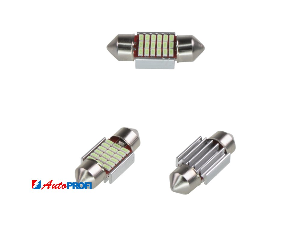 LED žárovka s paticí sufit (31 mm), světle modrá, s vestavěným rezistorem (nehlásí závady řídící jednotky na žárovce u nových vozidel) a chladičem, 18x SMD LED diody 3014SMD.