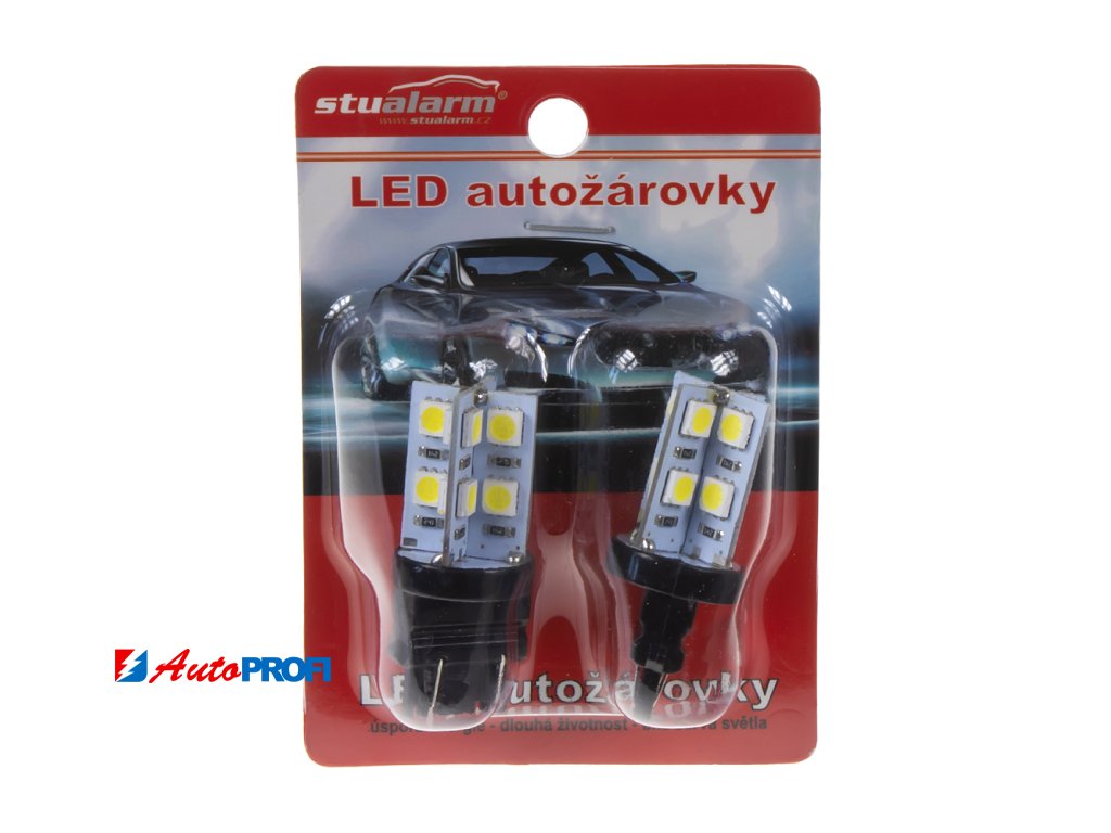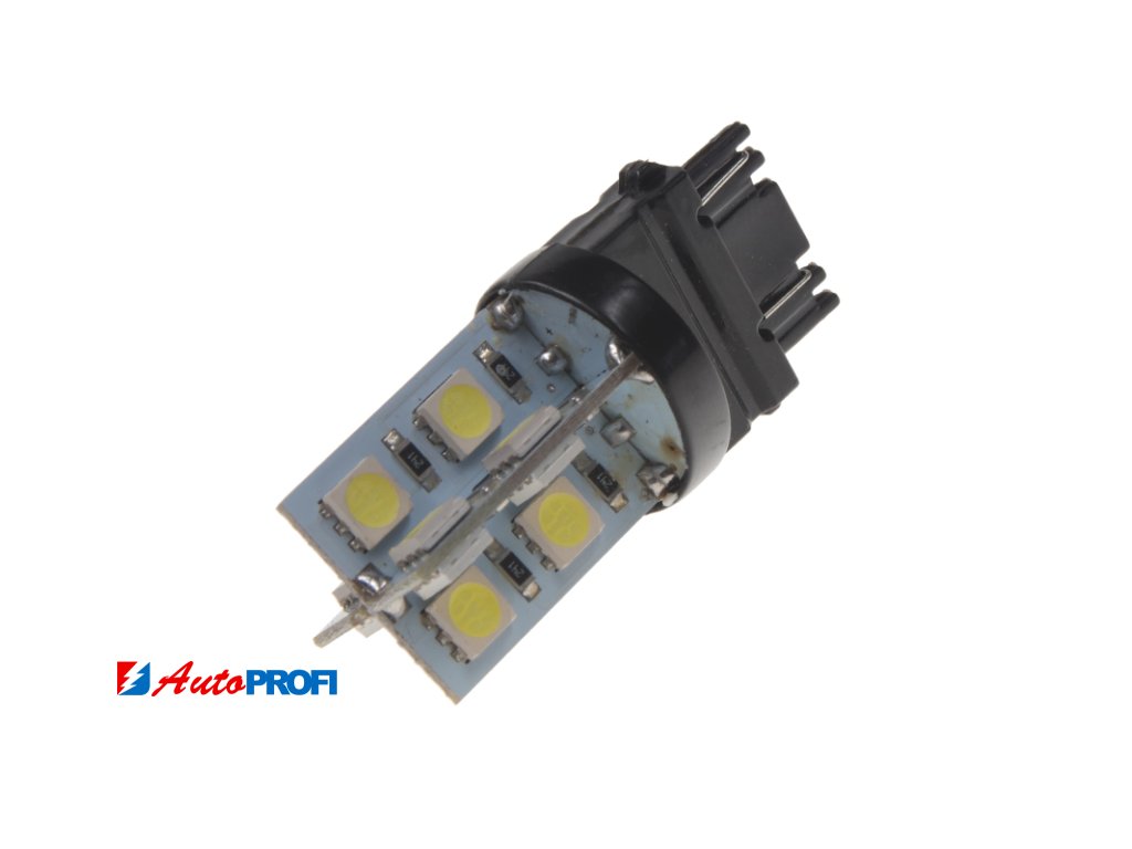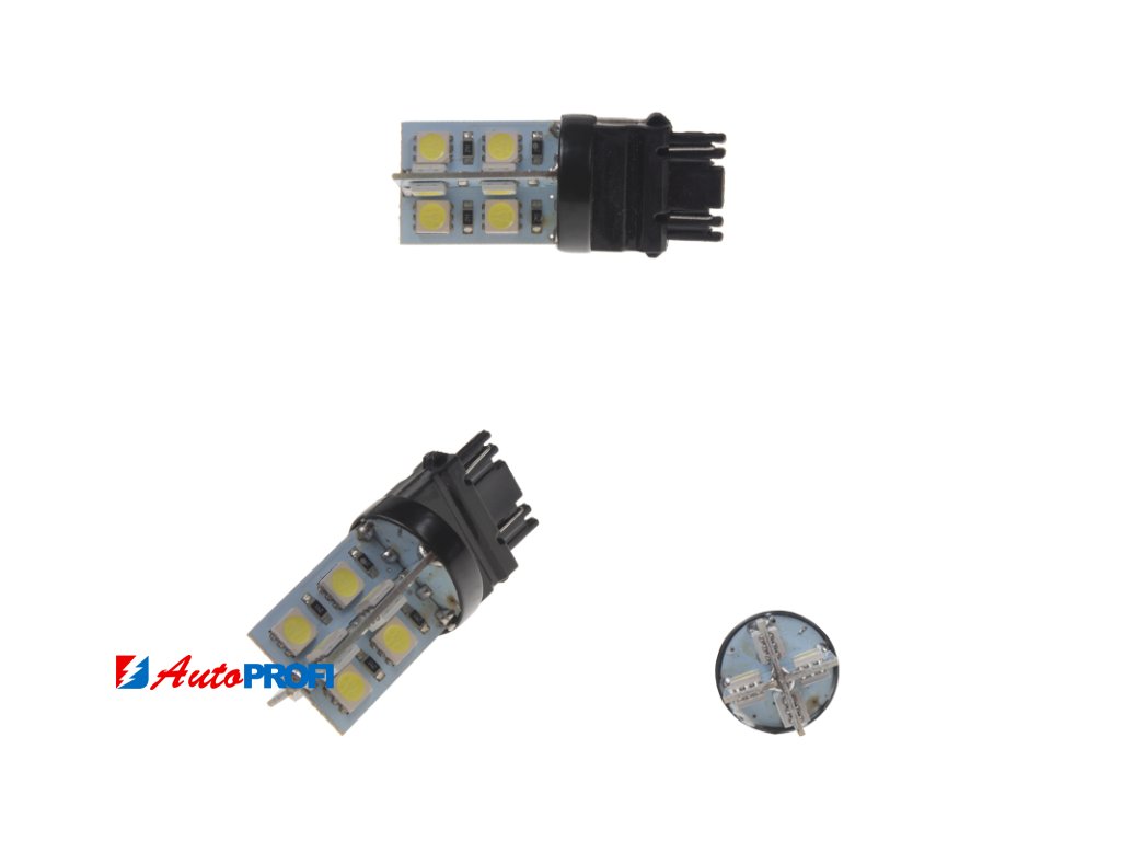 Náhradní LED žárovka s paticí T20 (3157 - W2,5x16d ), dvouvlákno, bílá, s vestavěným rezistorem (nehlásí závady řídící jednotky na žárovce u nových vozidel), 16x vysocesvítivé 3-čipové SMD LED diody. Tato žárovka se používá především v automobilech dovezených z USA automobilky Dodge, Ford, Chrysler.