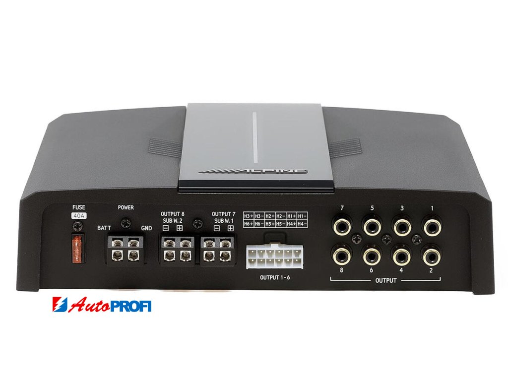 - Alpine OPTIM™8 se může pochlubit 8 kanály výkonu díky vestavěnému zesilovači (50 W x 6 @ 4 Ω + 150 W x 2 @ 4 Ω nebo 50 W x 6 @ 2 Ω + 300 W x 2 @ 2 Ω), což uživatelům umožňuje efektivně a snadno napájet celý systém. Použijte jej k posílení továrního systému nebo spárujte OPTIM™8 s reproduktory a subwoofery Alpine řady S a získejte tak výkonný systém v jakémkoli vozidle.