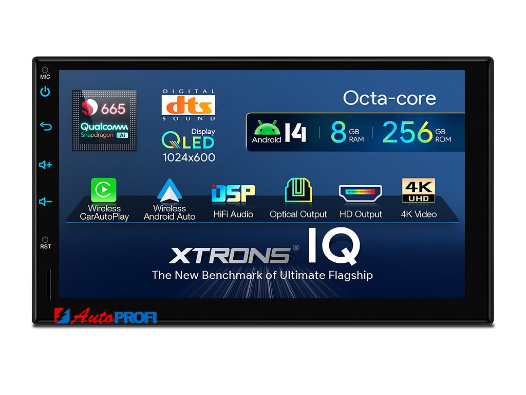 2DIN autorádio Xtrons TIQ742P se stane vaším neoddělitelným společníkem během jízdy. Užívejte si svou oblíbenou hudbu a další aplikace zcela plynule a bez zádrhelů. O stabilní provoz i při více spuštěných aplikacích současně se stará Android 14, osmijádrový procesor a 8 GB RAM operační paměť. Své aplikace, hudbu a další soubory můžete uložit do 256 GB interní paměti, kterou si navíc snadno rozšíříte microSD kartou. Náročný posluchač jistě ocení funkci DSP neboli digitální signálový procesor, který násobně zvyšuje kvalitu reprodukce. Za pomocí 4G modulu se z Vašeho autorádia stane smartphone, ze kterého můžete hravě odesílat SMS zprávy, využívat online GPS navigaci s aktuální dopravní situací či využívat další cenné funkce. Obraz QLED 7 palcové dotykové obrazovky bude vždy maximálně ostrý díky HD rozlišení. Můžete si na ni například vychutnat svůj oblíbený videoklip v aplikaci Youtube. Pro odreagování řidiče při dlouhých cestách nabízí rádio možnost moderního digitálního vysílání DAB+ včetně klasického FM tuneru. Ve výbavě nechybí také funkce Bluetooth 5.0, která řidiči zajistí bezpečí během telefonování. Váš mobilní telefon již zůstane navždy v kapse díky funkci CarPlay a Android Auto. Tato moderní služba Vám zajistí zrcadlení a ovládání telefonu přímo na obrazovce autorádia. Pohled z parkovací kamery Vám umožní bezpečné a ničím nerušené couvání. Menu je v českém jazyce.
