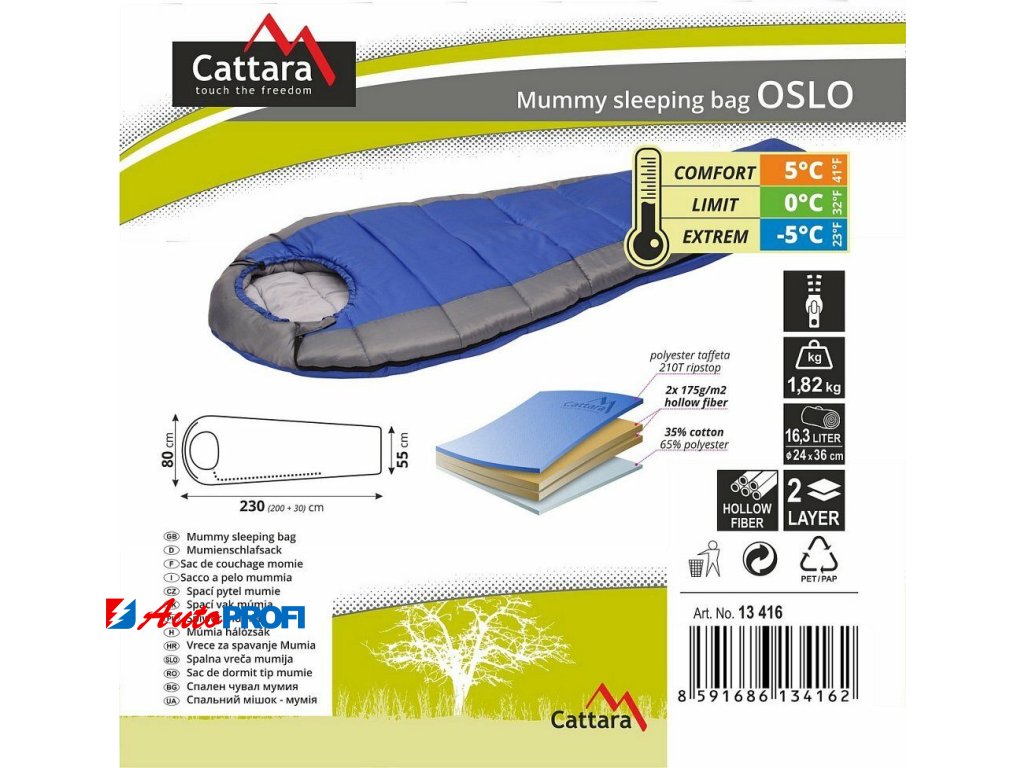 Spací pytel mumie Oslo, je spacákem, který dokonale kopíruje tělo a má tak nejlepší tepelně izolační vlastnosti, dále je vybaven zatažitelnou kapucí chránící hlavu.Spací pytel Oslo, je stejně jako veškeré spacáky typu mumie, vhodný zejména při delším pobytu v přírodě. Na komfort a teplotu uvnitř spacího pytle má vliv oblečení. Spánek je doporučen jen ve spodním prádle, případně s tričkem. Je totiž důležité vyhřát si spacák a zbytečně neohřívat oblečení.