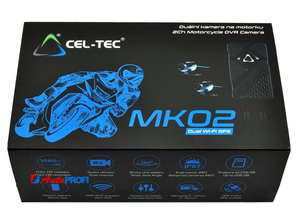 Duální kamera CEL-TEC MK02 Dual Wi-Fi GPS je primárně určena pro motocykly, ale může být použita stejně dobře v automobilu (s prodloužením kabelu zadní kamery). Díky podpoře až 256GB microSD karet není problém uchovat desítky hodin záznamu ve FULL HD rozlišení. GPS modul zaznamená údaje o trase a rychlosti a WiFi usnadní rychlé nastavení, prohlížení a stahování záznamů do telefonu. Součástí balení je také dálkový ovladač na kabelu s mikrofonem a indikační LED pro snadné a rychlé pořízení fotografie. Kamery jsou samozřejmě vodotěsné.