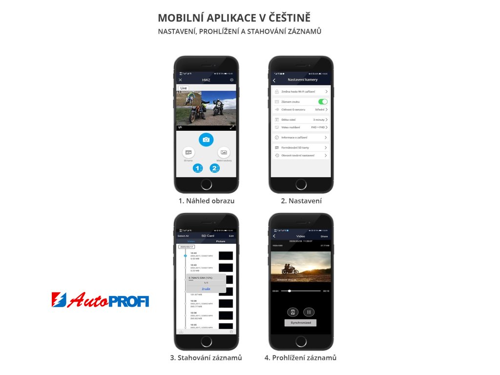 CEL-TEC MK02 DUAL Wi-Fi GPS je vybaveno dvojicí FULL HD kamer, díky kterým je za jízdy monitorována situace jak před, tak i za motorkou. Záznamy jsou ukládány a zpracovány v nahrávací jednotce, kterou lze bez problému schovat do útrob motocyklu, na microSD kartu velikosti až 256 GB. Samozřejmostí je možnost nahrávat do smyčky (po zaplnění karty se začnou přemazávat nejstarší pořízené záznamy) a nárazový g-senzor, který reaguje na prudký pohyb kamery (např. náraz). Pokud senzor takový pohyb zaznamená, uzamkne právě probíhající záznam proti přepsání, situace tak zůstane uchována na microSD kartě a vy můžete pokračovat v jízdě.