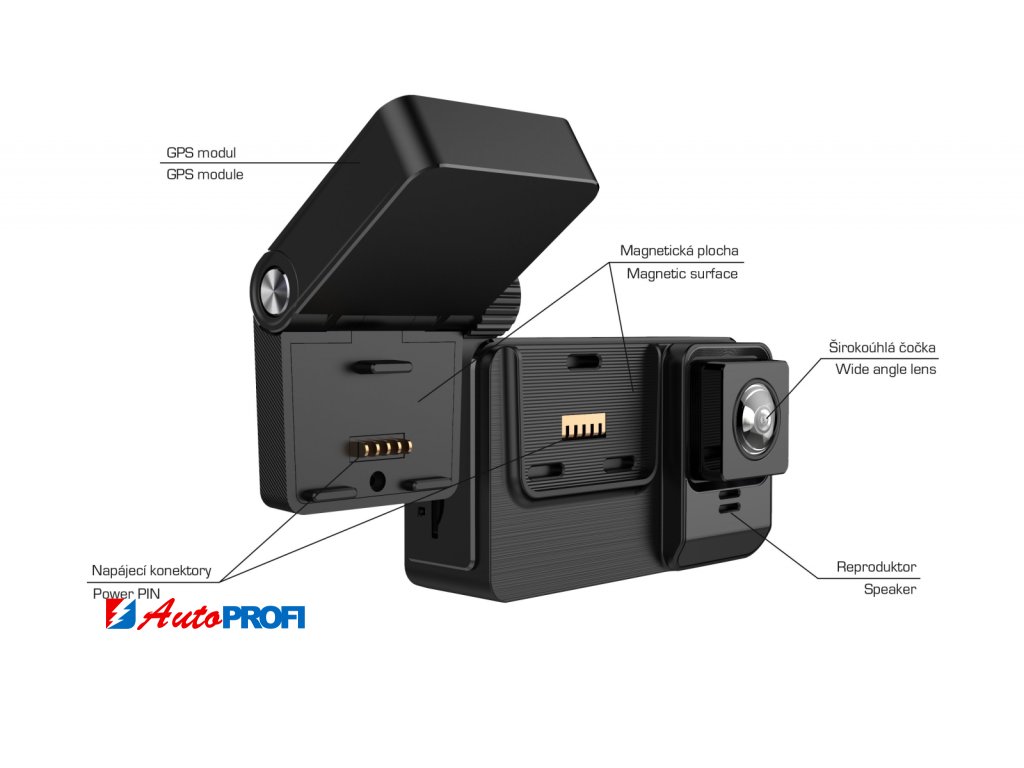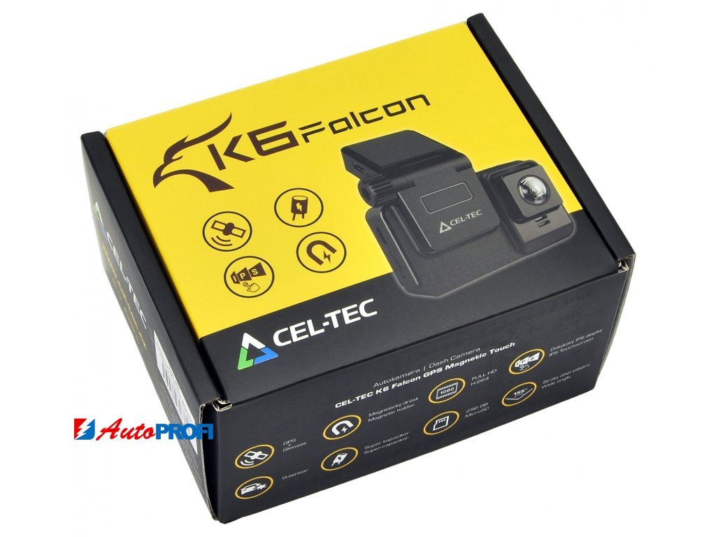 Přední FULL HD kamera do auta CEL-TEC K6 Falcon GPS Magnetic Touch. Mezi hlavní přednosti K6 Falcon patří magnetický držák, díky kterému se s kamerou velice snadno manipuluje, ale zároveň je dostatečně silný a stabilní. Dále GPS modul pro záznam trasy a rychlosti, dotykový IPS displej a menu v češtině, superkapacitor namísto baterie, podpora až 256 GB microSD karet, nebo třeba široký úhel záběru 155°.