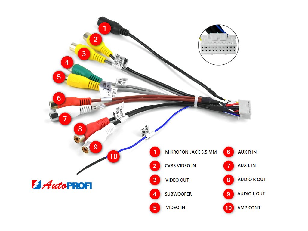 Díky konektoru 20 PIN se tento propojovací kabel jednoduše propojí s autorádiem bez nutnosti instalace doplňků do autorádia. Samotné výstupní konektory jsou zřetelně označené a tím odpadá nutnost studování schémat zapojení příslušenství.
