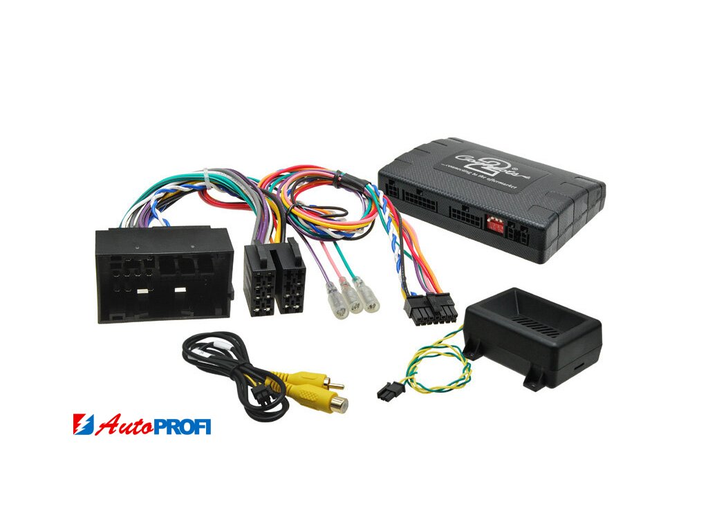 Informační adaptér pro zobrazení informací o vozidle na monitoru dodatečně instalované AV jednotky, ovládání na volantu a připojení parkovací kamery.