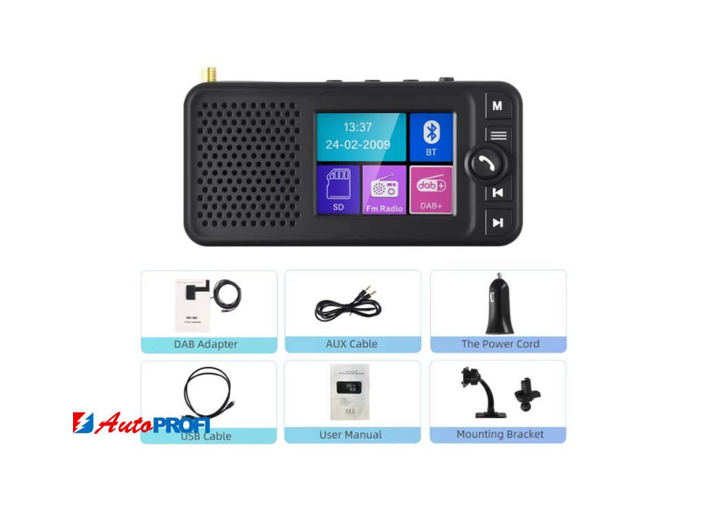Tento přijímač umožní přijímat digitální rozhlasové vysílání DAB / DAB+ a příjem FM. Přenos zvuku do autorádia probíhá přes FM modulátor nebo pomocí AUX výstupu, pro venkovní použití je integrován reproduktor.