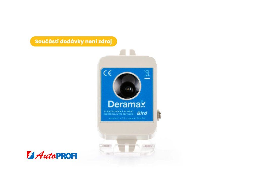 Plašič Deramax-Bird je napájený pomocí síťového zdroje. V naší nabídce najdete jak plašiče napájené ze síťového zdroje, tak plašiče napájené z baterií. Bateriové i zdrojové typy plašičů Deramax pracují ale zcela jiným způsobem a každý typ je optimalizovaný pro „svůj“ typ napájení. „Univerzální plašiče“ s možností napájení jak z baterií, tak i z napájecího zdroje u nás tedy nenajdete. Výrobou takových plašičů bychom znehodnotili jejich účinnost.