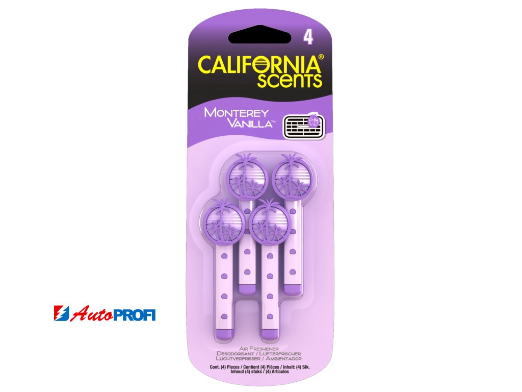 Vůně California Scents jsou osvědčené osvěžovače vzduchu s koncentrovanou a jemnou vůní. Vůně jsou 100% organické. Stačí umístit tyčinku Vent Stick do ventilační mřížky a ihned si můžete užívat osvěžující vůni celé týdny. Díky decentnímu vzhledu tyčinky Vent Stick bude vzhled Vašeho interiéru dokonalý. Všechny produkty California Scents jsou "made in California"!