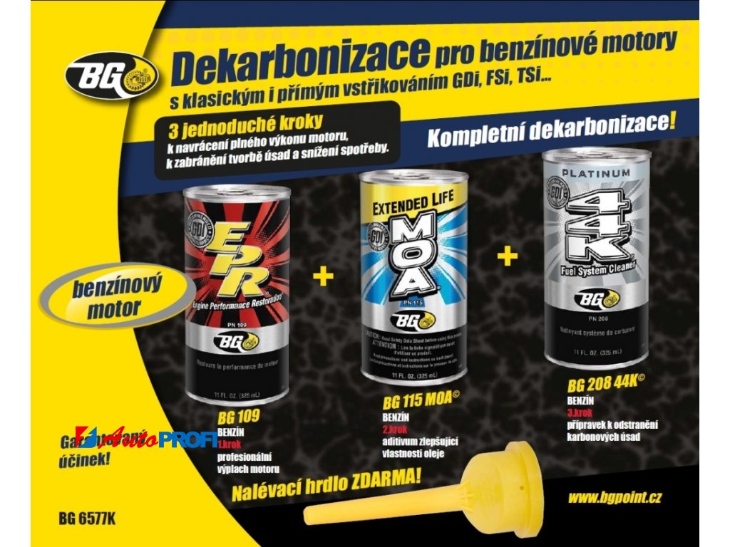 BG kompletní dekarbonizace olejového, palivového, spalovacího a výfukového systému. Velmi snadno, absolutně bezpečně a efektivně odstraní úsady a zabrání jejich tvorbě. Zvýší výkon motoru, sníží spotřebu, opotřebení a emise. Používejte každých 15000 km a Váš motor bude stále v dobré kondici.