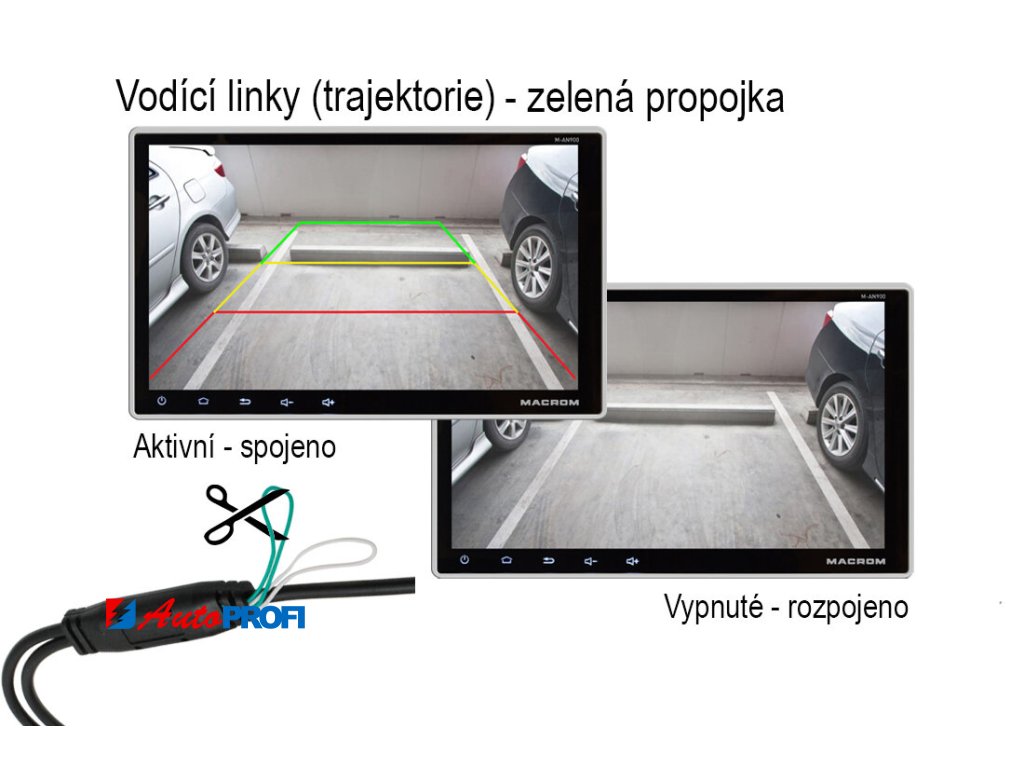 Kamera umožňuje zobrazení nebo skrytí trajektorií (vodících linek). Funkce je aktivní při spojené zelené smyčce v kabelovém svazku u kamery (výchozí nastavení - zobrazení vodících linek).