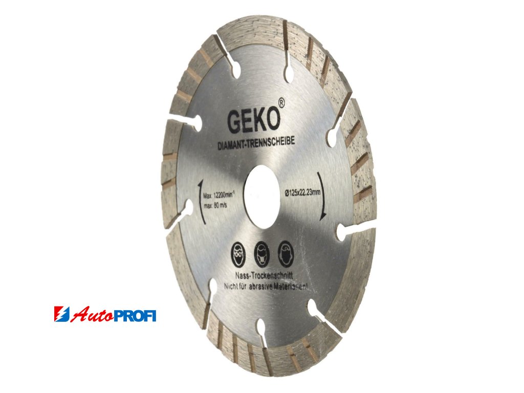 Precizní diamantový řezný turbo-segmentový kotouč GEKO s přerušovaným diamantovým segmentem (s drážkami, výřezy), který je rozdělený na určitý počet užších segmentů a prolamováním po celém obvodu. Díky segmentům a prolamování tento kotouč chladí lépe jak ostatní kotouče, lépe vynáší obroušený materiál z řezu ven a řezání je rychlejší, avšak může docházet ke štípání hran a výsledný řez je širší. Turbo-segmentový kotouč se hodí pro hluboké řezání tvrdých stavebních materiálů jako je např. beton, železobeton, asfalt, zdivo, kámen, zámkový dlažba apod. S turbo-segmentovým kotoučem je možné řezat za mokra i za sucha.Technické parametry: