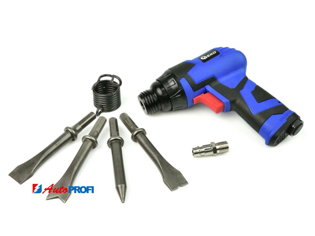 Pneumatické kladivo je výkonným nástrojem, který vám umožní řezat, sekat a děrovat kov, pomůže při odsekávání nýtů, bodových svárů. Dále se dá kladivo využít ve stavebnictví pro sekání drážek, záseků, k odstranění kachliček, opracování kamene. Pozor: kladivo není vhodné k rozbíjení betonu. Kvalitní zpracování dělá toto kladivo odolným pneumatickým nářadím určeným pro dílny, servisy a garáže. Kryt kladiva je odolný proti vlivům jako je prach a nečistoty. Kompletní sada umožňující okamžité zahájení práce bez nutnosti nákupu příslušenství. V sadě jsou čtyři sekáče, rychlospojka 1/4" , a pružina, která umožňuje bezpečnou práci s kladivem. Pro pohodlnější práci a lepší úchop má protiskluzovou pogumovanou rukojeť. Obsluha kladiva je snadná a bezpečná, výměna dláta je intuitivní a rychlá. Kladivo je vybaveno pružinovým držákem, kterým prochází hrot dláta, aby zapadl do montážního držáku. Po utažení pružiny držák pružiny přesahuje přes prstenec dláta a zabraňuje vypadnutí pracovního sekáče.Obsah balení: