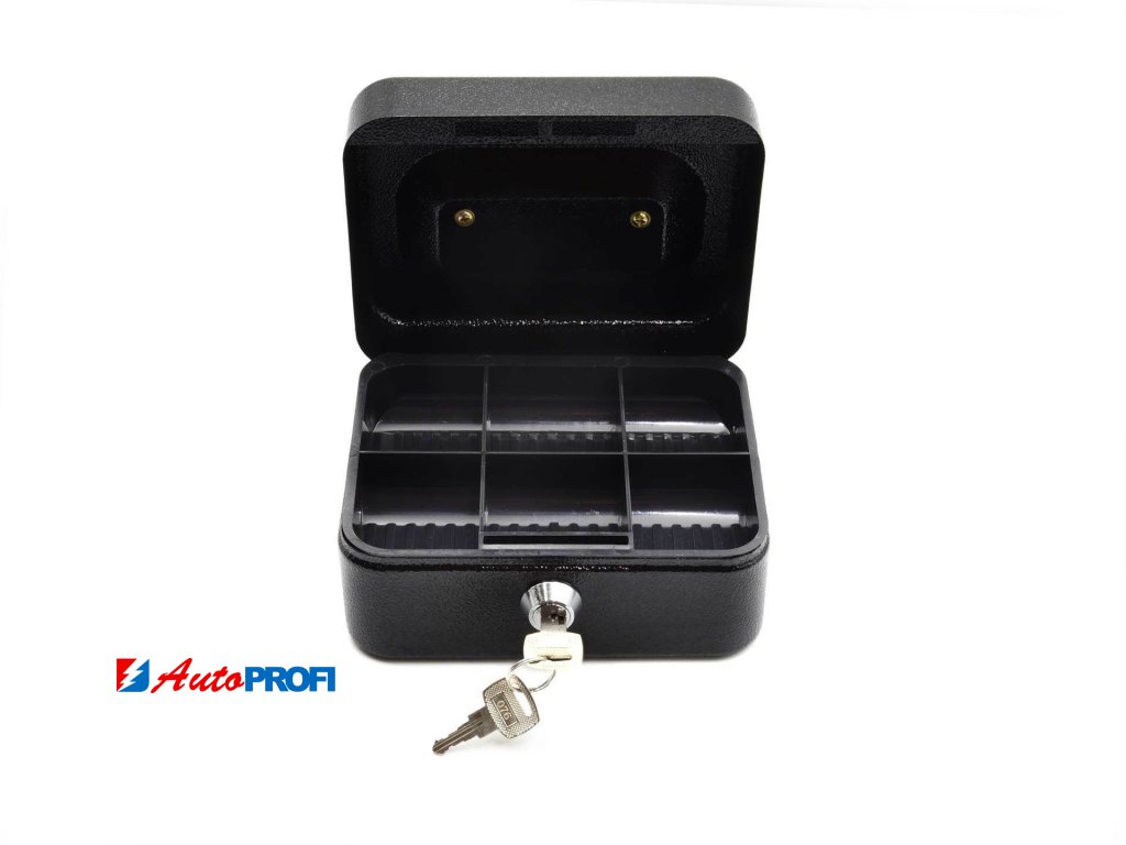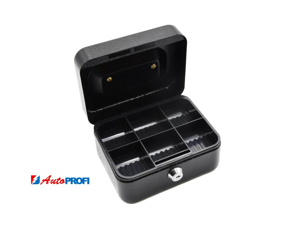 Praktická kovová schránka na peníze uzamykatelná klíčem je vybavena nosnou rukojetí a vnitřním plastovým pořadačem na mince.Hlavní výhody