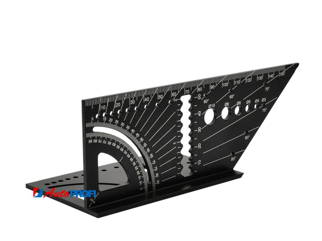 Praktický hliníkový úhelník je určen pro měření a přesné přenášení míry na trojrozměrné materiály. Úhelník je vybaven pomůckou pro rychlé určení průměru vrtáku a je ideální pro přesné přenášení pokosových úhlů na dvě sousední strany obrobku.Technické parametry: