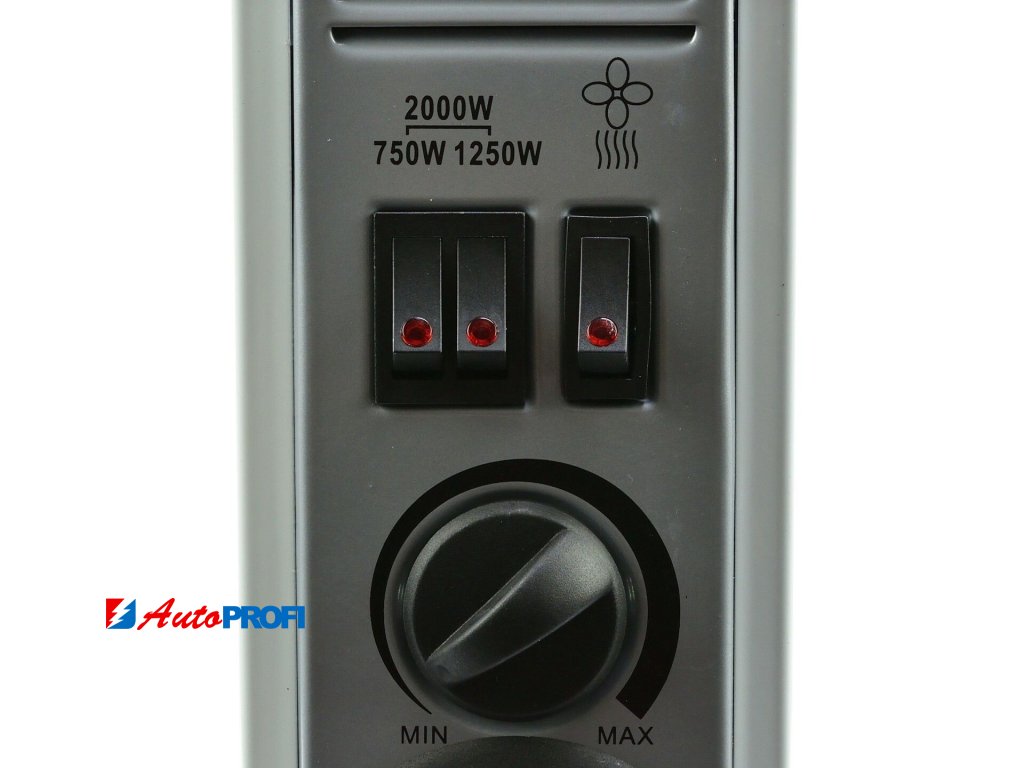 - Disponuje 3 stupňovou regulací teploty: I. 750W, II. 1250W, III. 2000W