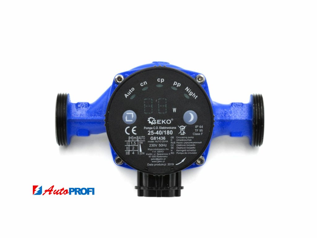 Elektronické energeticky úsporné oběhové čerpadlo pro instalace ústředního topení 25-40 / 180 (AUTO 25 / 4A). Určeno k oběhu teplé vody. Energeticky úsporné čerpadlo GEKO umožňuje automatické řízení tlakového rozdílu regulováním otáček a jejich přizpůsobením aktuální poptávce.