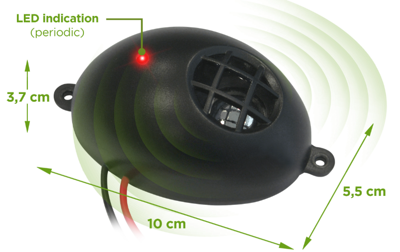 Přístroj vydává vysokofrekvenční zvuky v 15-ti sekundových intervalech ve dne i v noci. Tyto zvuky, které jsou pro lidské ucho sotva slyšitelné, odpuzují zvířata a zabraňují, aby si zvířata zvykla na zvuk.