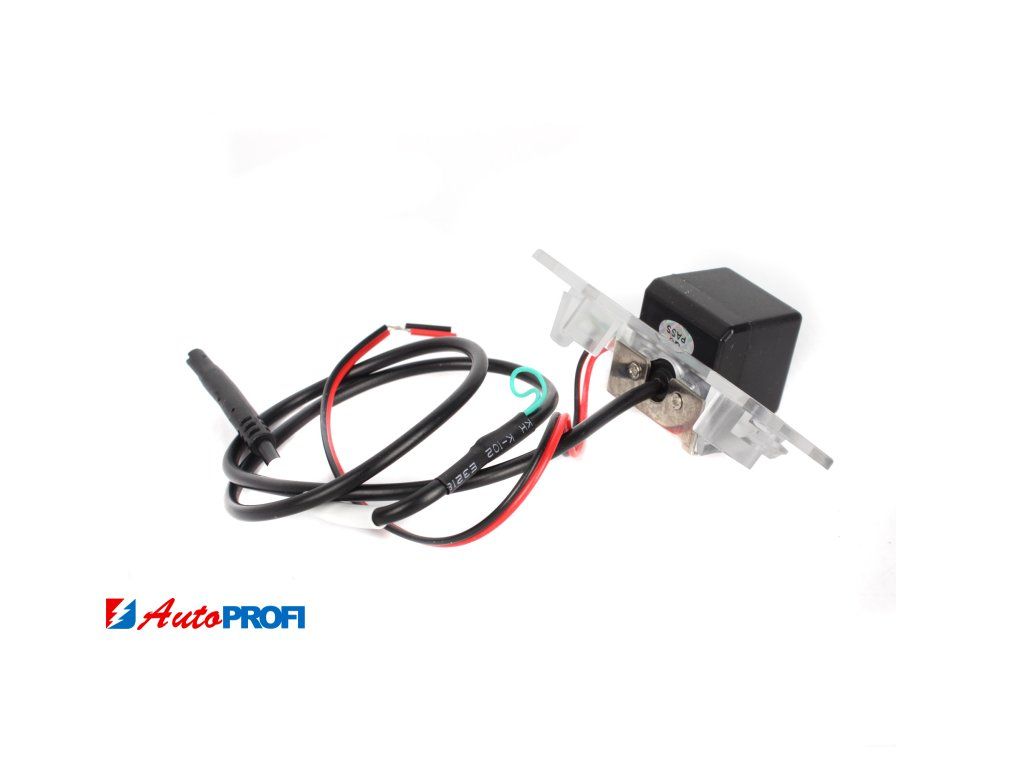 OEM barevná parkovací kamera pro instalaci do lampy pro osvětlení zadní registrační značky. Součástí kamery je LED světlo nahrazující původní osvětlení.