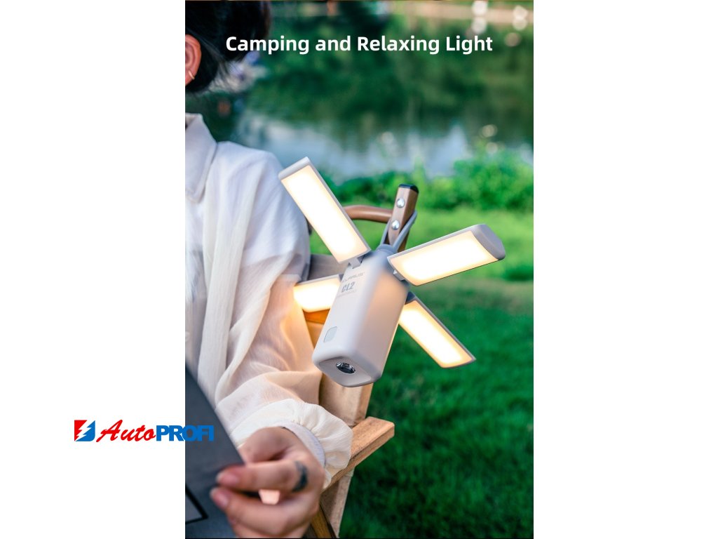 Skládací kempingová svítilna je vybavena 4 LED panely o maximální světelném výkonu 750 lumenů, které jsou samostatně polohovatelné až o 90°, díky čemuž lze libovolně měnit směr osvětlení a tím se vyhnout nepříjemnému oslnění nebo rušení okolí. Díky variabilitě rozkládání a praktickému držadlu lze svítilnu jednoduše zavěsit ve stanu nebo třeba umístit na stůl.