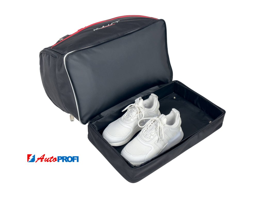 Asymetricky zkosená strana cestovních tašek KJUST zajišťuje, že taška přesně přiléhá k zadnímu sedadlu automobilu a umožňuje plně využít zavazadlový prostor.