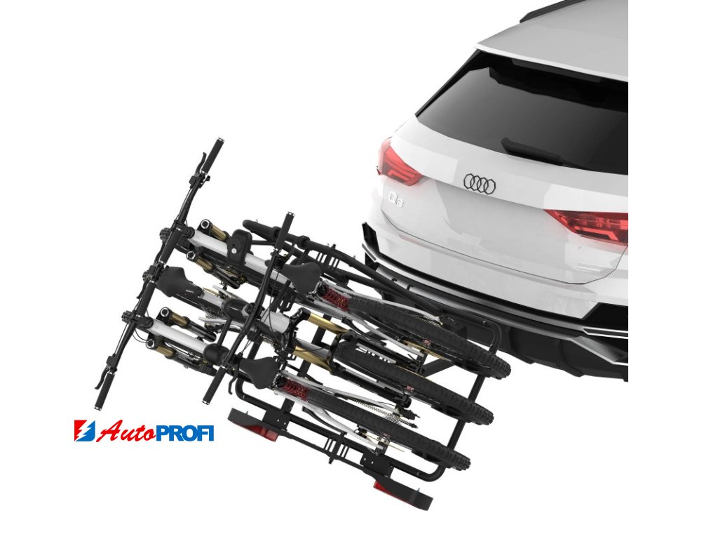 Materiál: Alu + plastové díly Kapacita: 3 kola Max. nosnot: 15 kg / 1 kolo Hmotnost: 23 kg Vhodné pro pneu: až 2,25" Vhondé pro kola: 20-29" Vhodné pro rámy: 26-55mm Rozteč mezi koly: 17,5cm Sklopný: Ano (mechanicky) Typ zástrčky: 13 pinů Systém ochrany proti krádeži: platforma volitelně, držáky kol ano