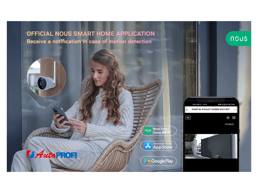 Venkovní chytrá 3MP WiFi kamera Nous W7P se snadno instaluje a připojuje k síti prostřednictvím WiFi. Pomocí aplikace Tuya Smart nebo aplikace Nous Smart si můžete prohlížet živé záznamy, přehrávat nahrávky a přijímat oznámení na svém chytrém telefonu. Můžete také komunikovat s návštěvníky nebo narušiteli prostřednictvím vestavěného mikrofonu a reproduktoru nebo spustit světelné a zvukové efekty, které je vystraší.