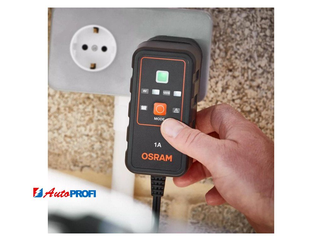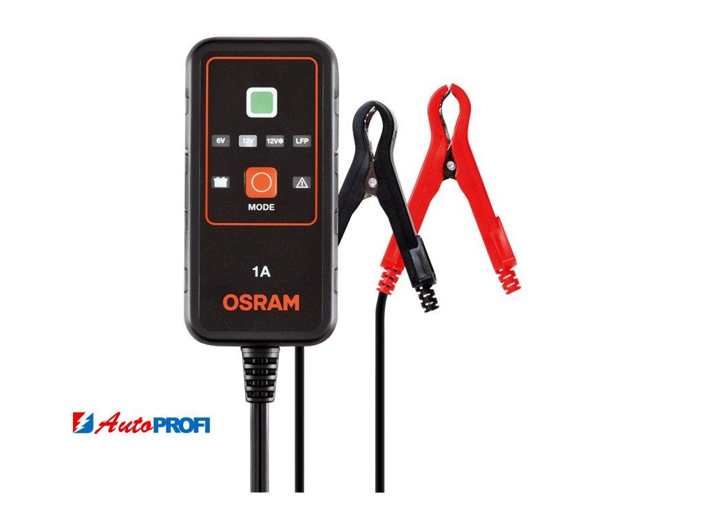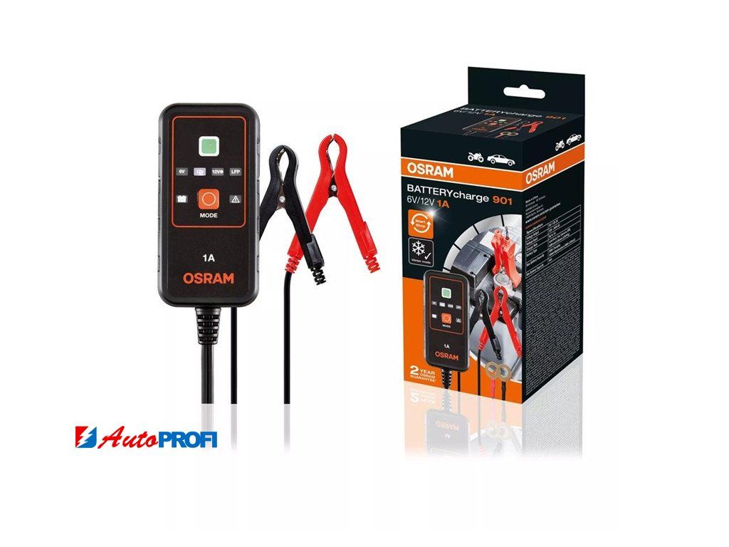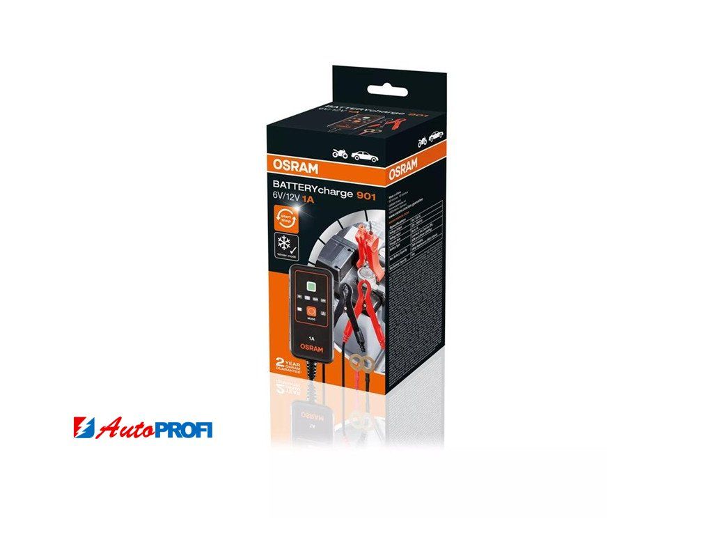 Inteligentní nabíječka s udržovacím režimem baterie, s vícestupňovým nabíjecím cyklem OSRAM BATTERYcharge 901 je inteligentní nabíječka s funkcí udržování baterie 1 A pro 6 V a 12 V vozidla, včetně motocyklů a většiny menších automobilů.